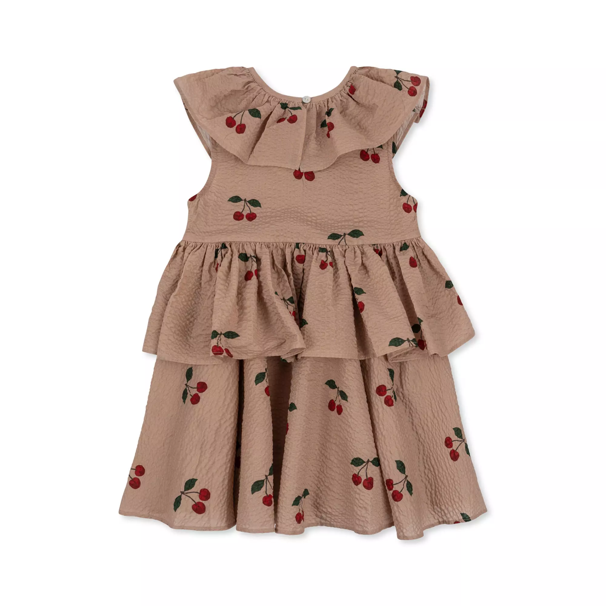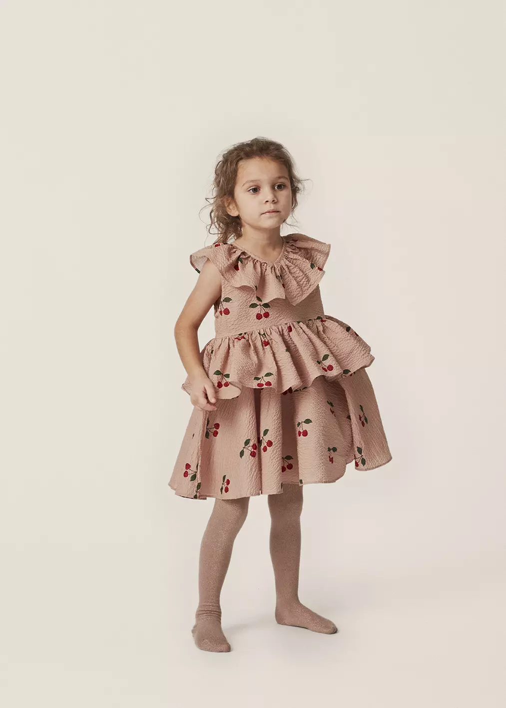 Sukienka z falbanami Konges Slojd i efektownymi wisienkami w dyżym rozmiarze.