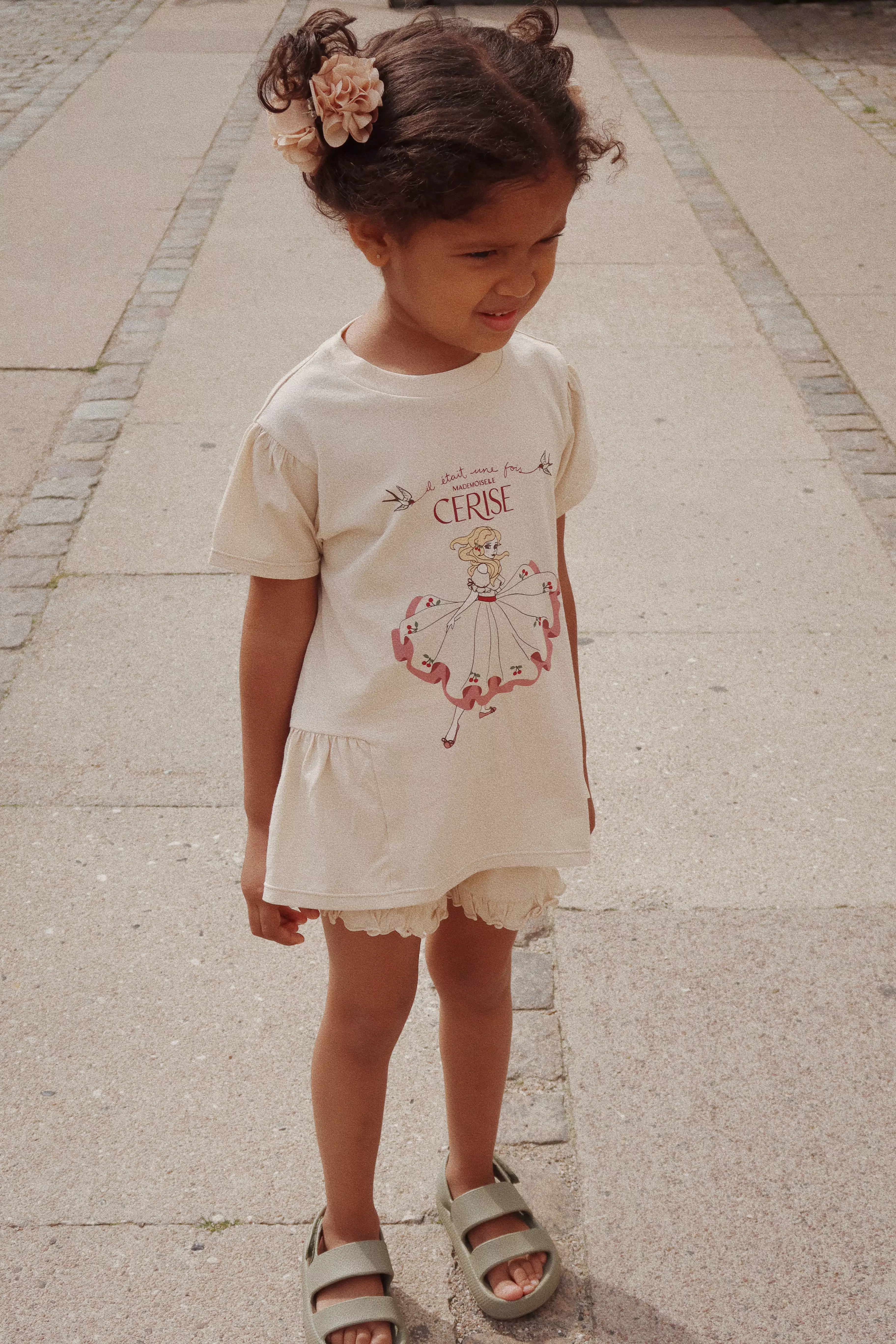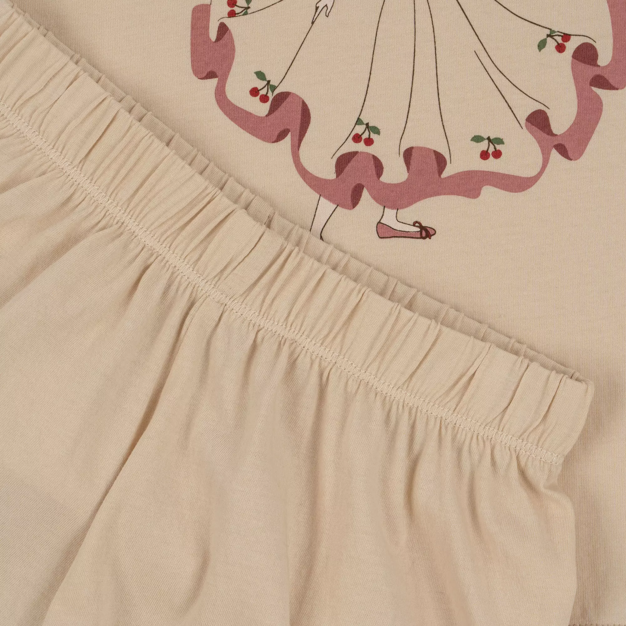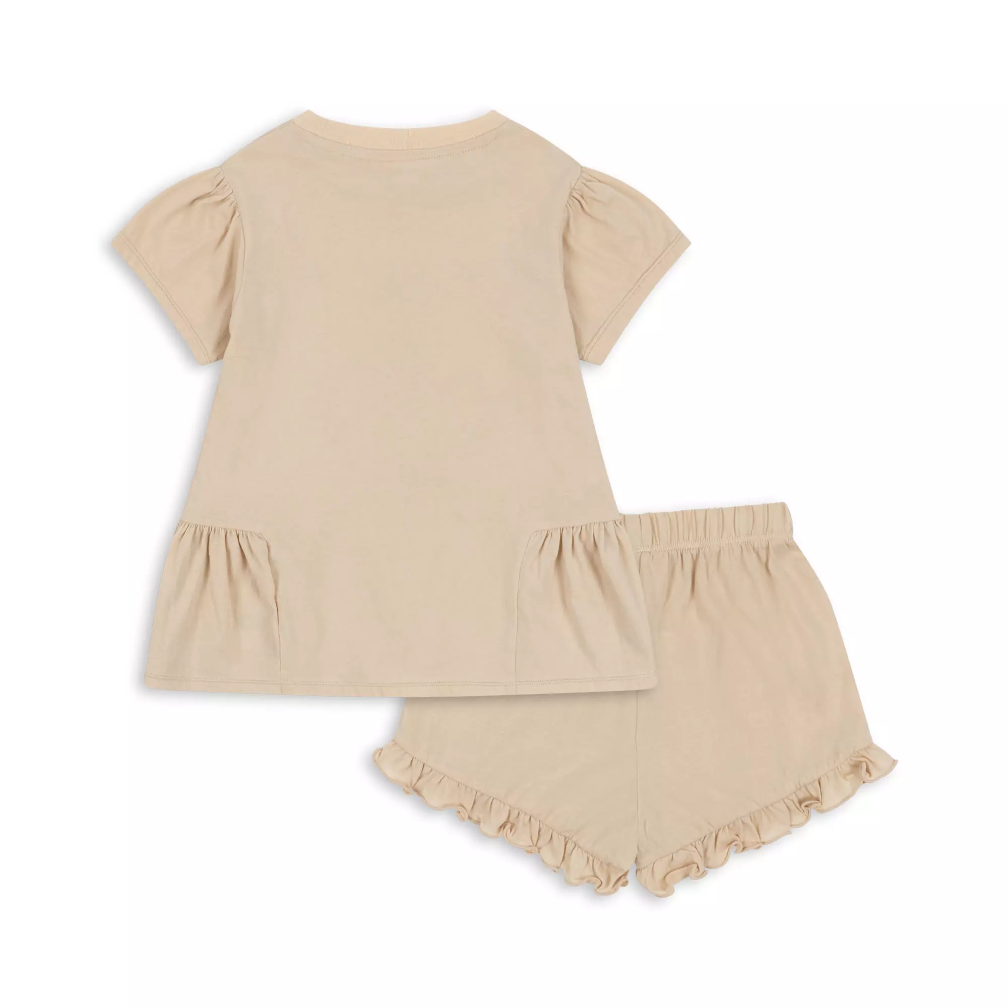 Stwórz uroczy letni look dla Twojego dziecka dzięki zestawowi FAMO FRILL od Konges Slojd. Ten dwuczęściowy zestaw z bawełny zawiera pasującą koszulkę i spodenki z falbanką, nadającym mu uroku i stylu.