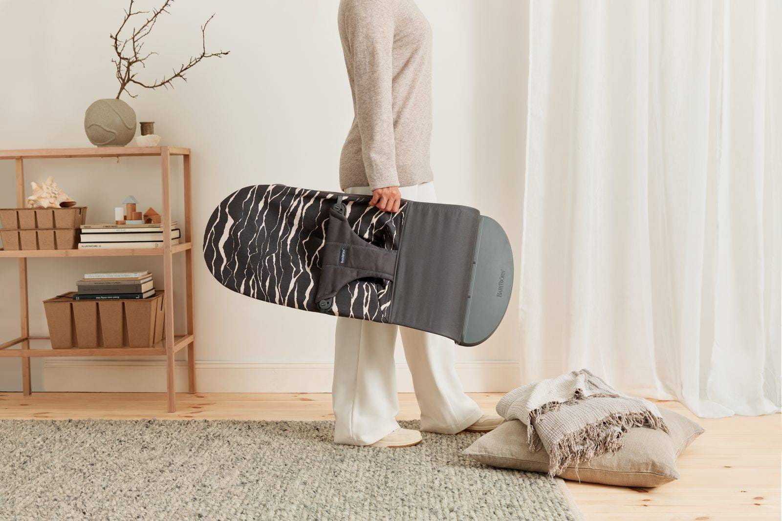 Leżaczek BabyBjorn zapewnia Twojemu dziecku przytulne miejsce do zabawy i odpoczynku. Porusza się dzięki naturalnym i spontanicznym ruchom dziecka. Dziecko bujając się rozwija zdolności motoryczne oraz równowagę w całkowicie naturalny dla siebie sposób. Młodsze dziecko można delikatnie i cicho kołysać ręką lub stopą.