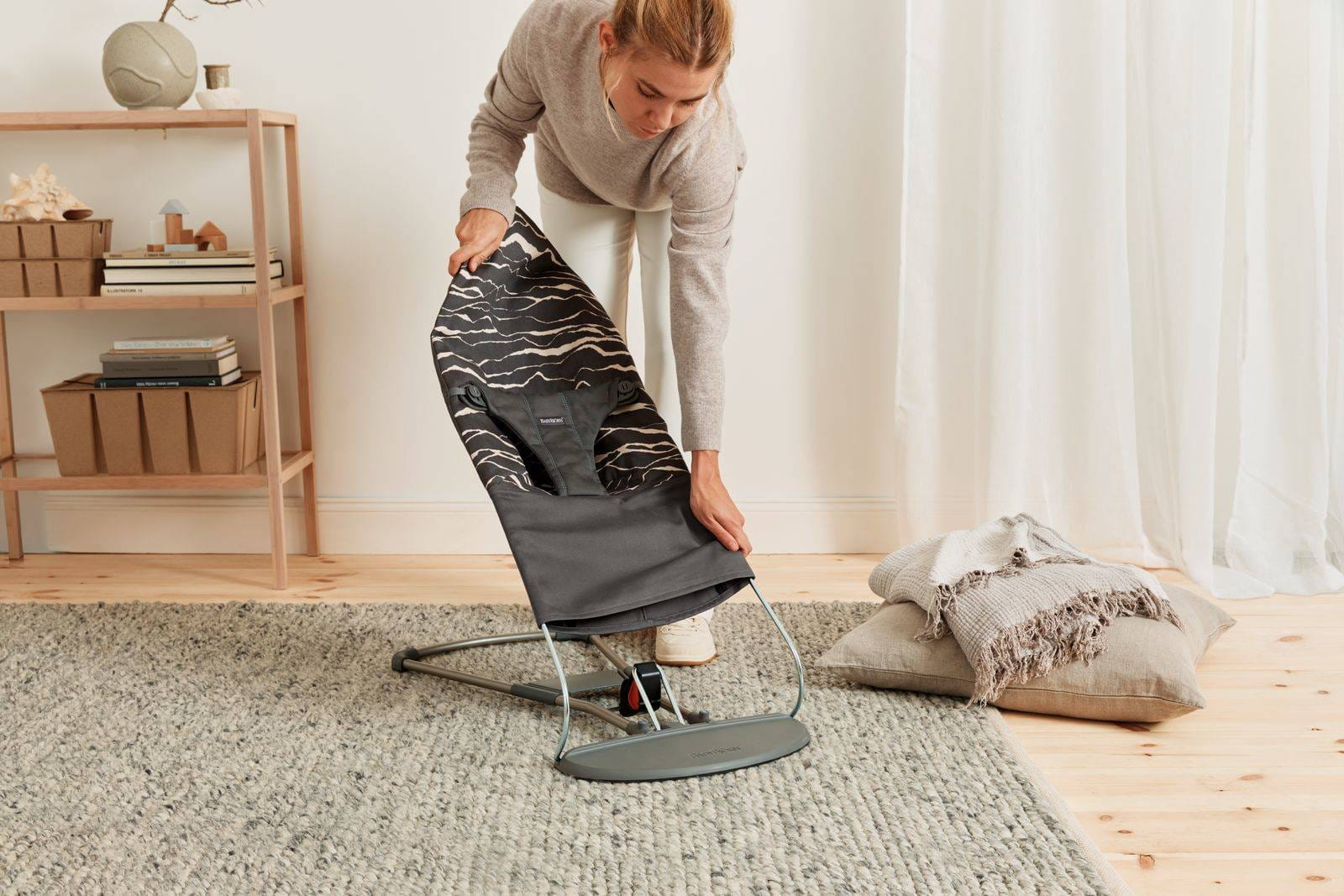 Dzięki dwustronnemu poszyciu leżaczek BABYBJÖRN Bliss może być użytkowany zarówno jako leżaczek jak i fotelik. Leżaczek jest idealnym rozwiązaniem od okresu niemowlęcego do momentu, w którym dziecko nauczy się stabilnie siedzieć. Dla starszych, już chodzących dzieci leżaczek można łatwo przekształcić w wygodny fotelik - wystarczy zdjąć i odwrócić materiał z oparcia oraz zmienić jego stopień nachylenia.