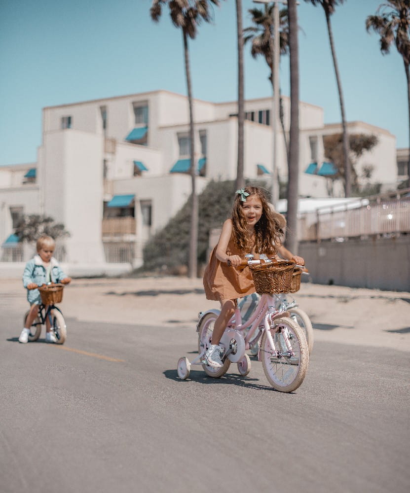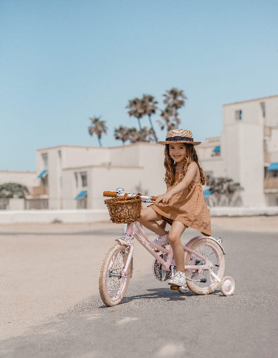 Zainspirowane stylem retro i skandynawskim wzornictwem. Lekka aluminiowa rama w kolorze białym lub różowym, brązowe skórzane siodełko i dopasowane uchwyty, sprawią, że jego właściciel będzie najbardziej "cool" mini rowerzystą w okolicy! Rowerek wyposażony jest w unikatowe palisandrowe pedały, stylowe kremowe opony oraz wiklinowy, odpinany kosz, idealny do spakowania prowiantu na dzień pełen przygód.