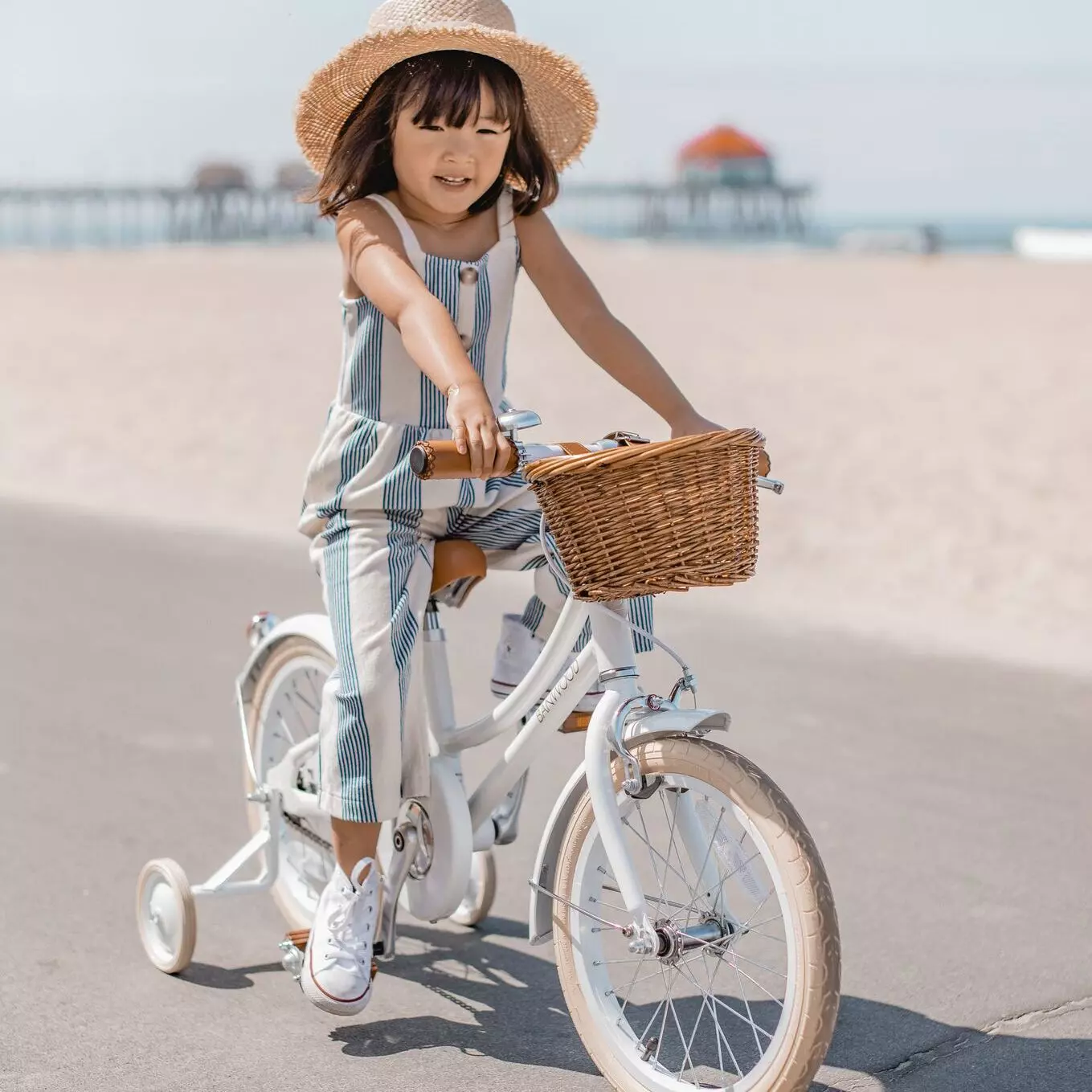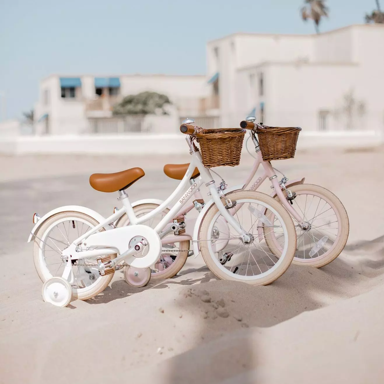 Zainspirowane stylem retro i skandynawskim wzornictwem. Lekka aluminiowa rama w kolorze białym lub różowym, brązowe skórzane siodełko i dopasowane uchwyty, sprawią, że jego właściciel będzie najbardziej "cool" mini rowerzystą w okolicy! Rowerek wyposażony jest w unikatowe palisandrowe pedały, stylowe kremowe opony oraz wiklinowy, odpinany kosz, idealny do spakowania prowiantu na dzień pełen przygód.