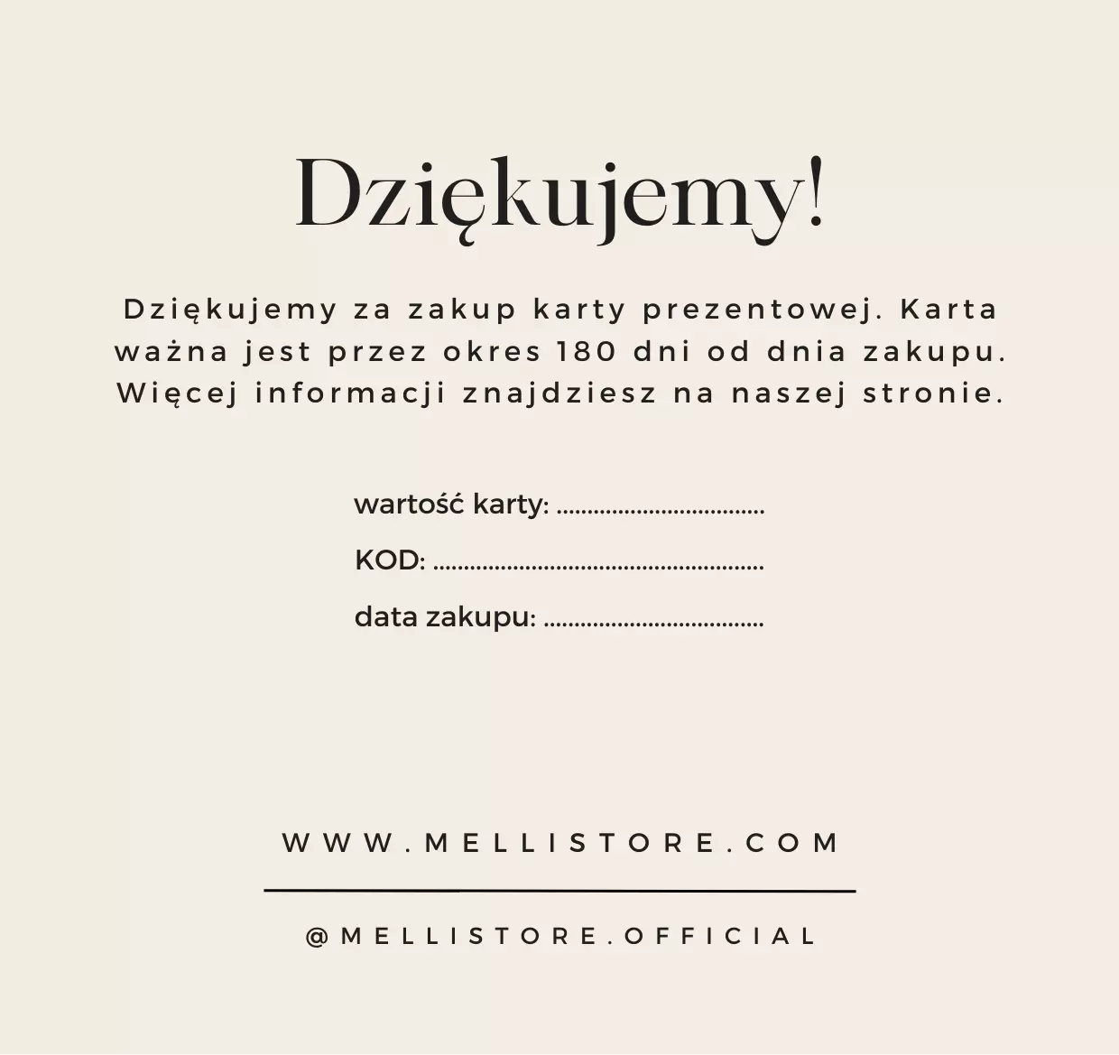 WAŻNE! Karta nie podlega zwrotom ani wymianie na gotówkę ani na inny bon. Nie zwracamy środków niewykorzystanych. Karta Podarunkowa nie podlega rabatom. Wykorzystać można ją tylko w sklepie www.mellistore.com