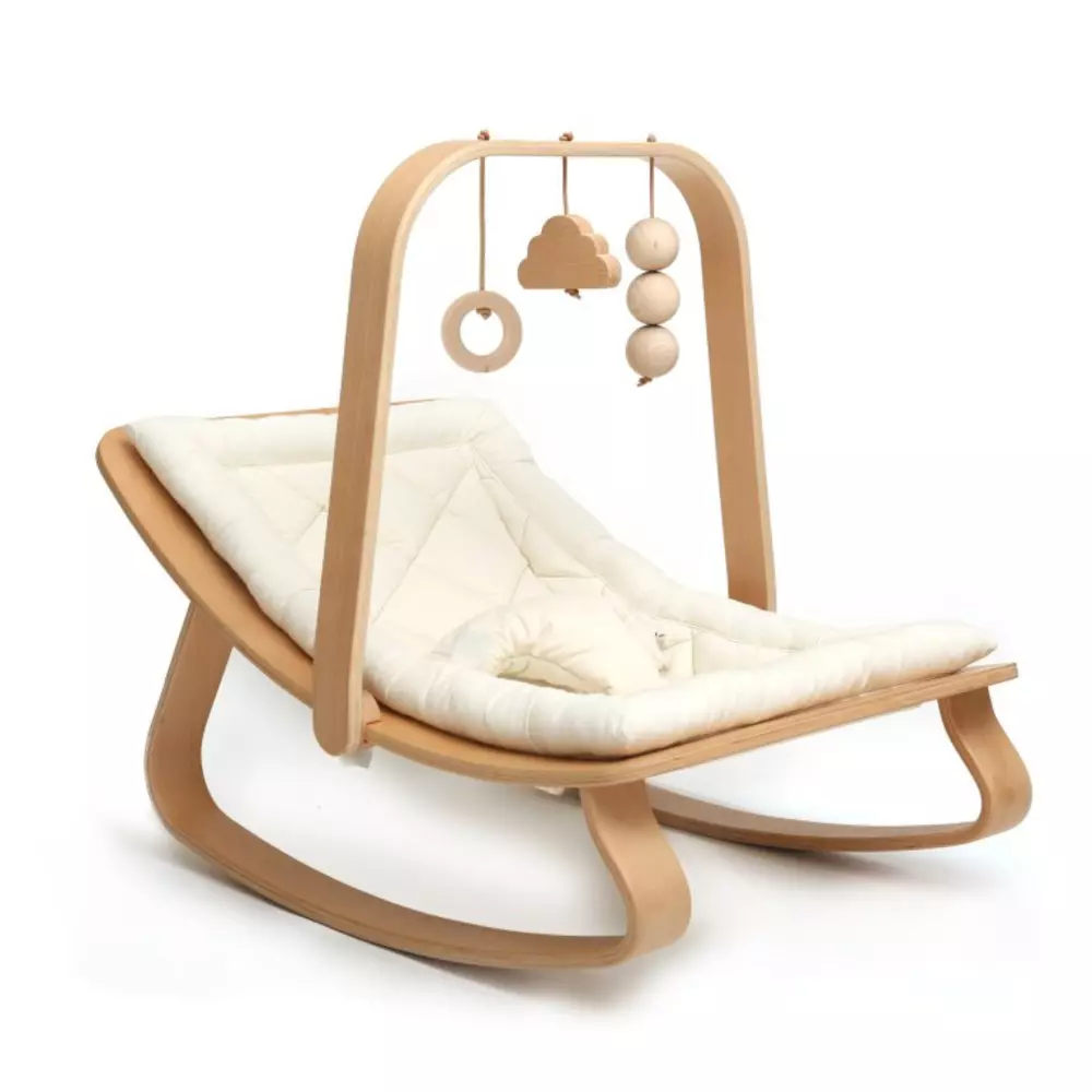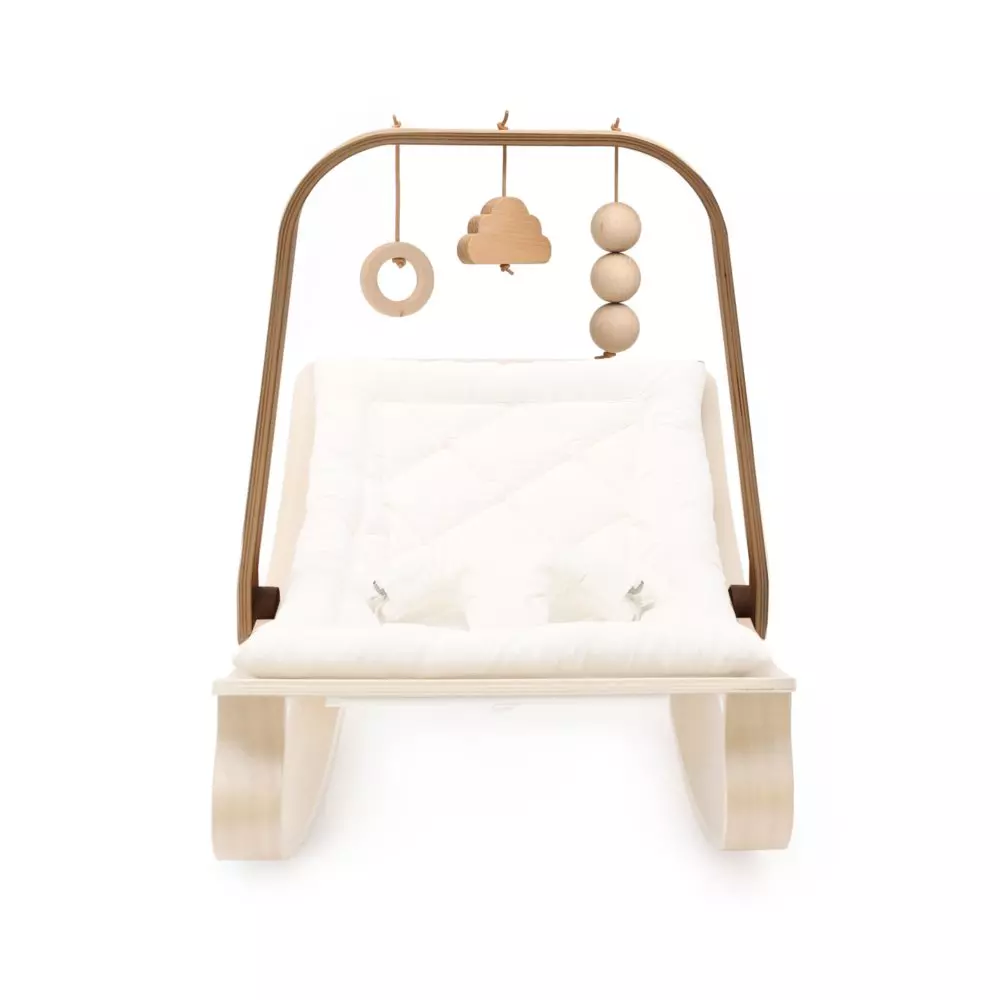 Piękny, drewniany pałąk do bujaka LEVO, urzeka swoją prostotą i funkcjonalnym designem. Zawarte w komplecie drewniane zabawki, zachęcają malucha do aktywności, stymulując rozwój i koordynację, już od urodzenia.