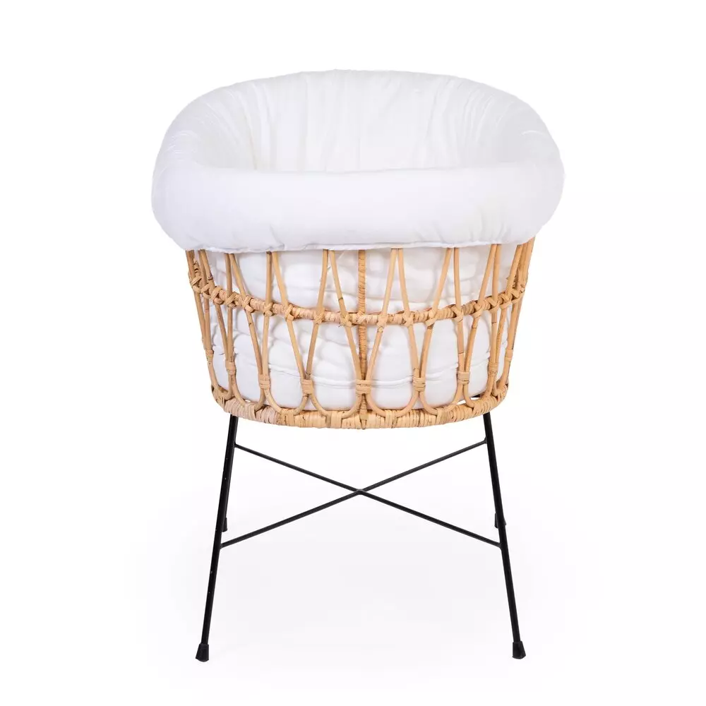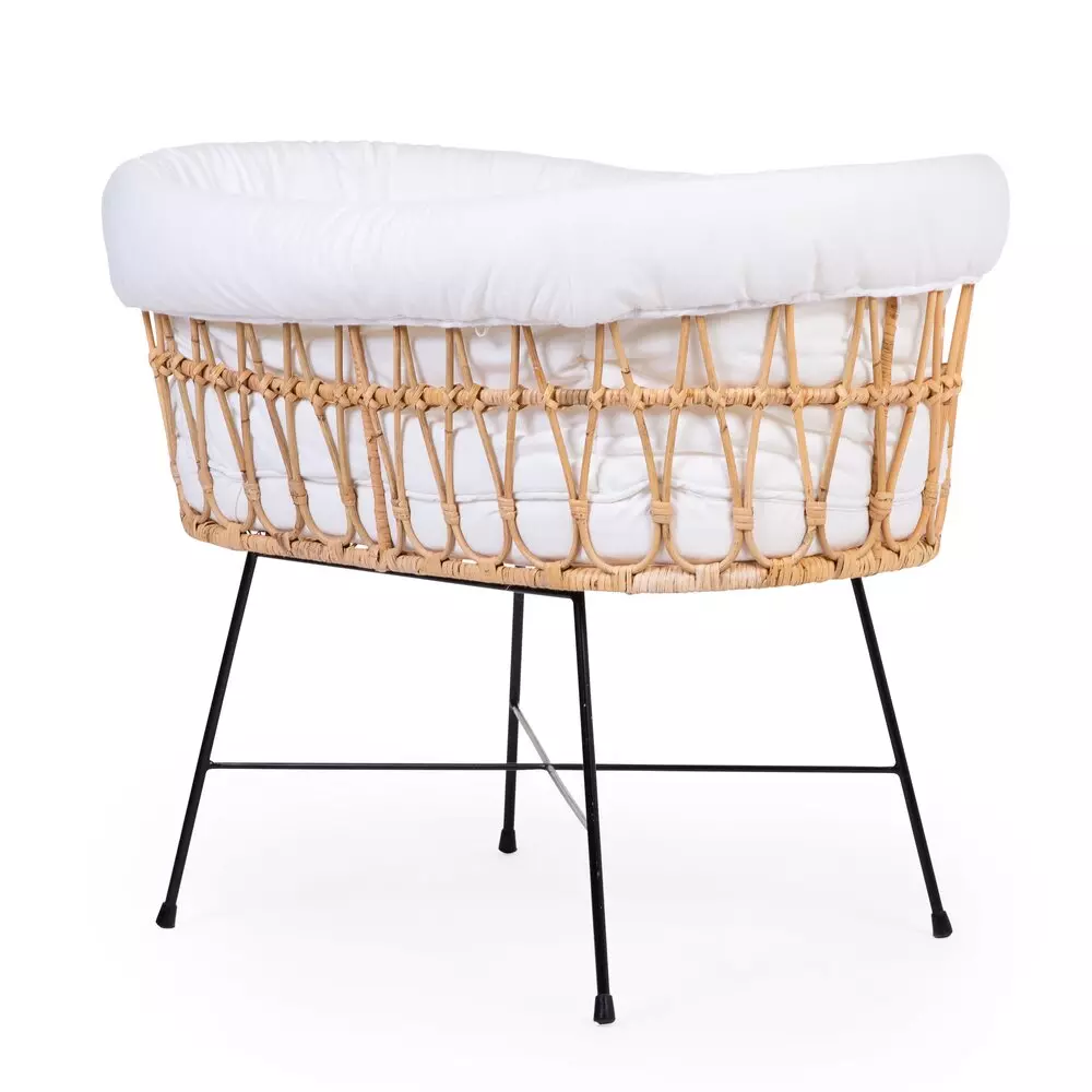 Piękne łóżeczko wykonane z naturalnego, najwyższej jakości rattanu, osadzone na czarnych metalowych nogach, wniesie do Twojego domu niepowtarzalny klimat. Mebel jest bardzo stabilny dzięki metalowej konstrukcji, a okrągły kształt i staranne wykończenie sprawią, że dziecko będzie czuło się w nim komfortowo i przytulnie. Łóżeczko może być używane od urodzenia do 6 miesiąca życia. W zestawie ochraniacz wyściełający spód i boki oraz owalny materac ze zdejmowanym pokrowcem.
