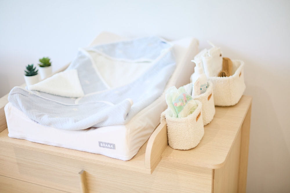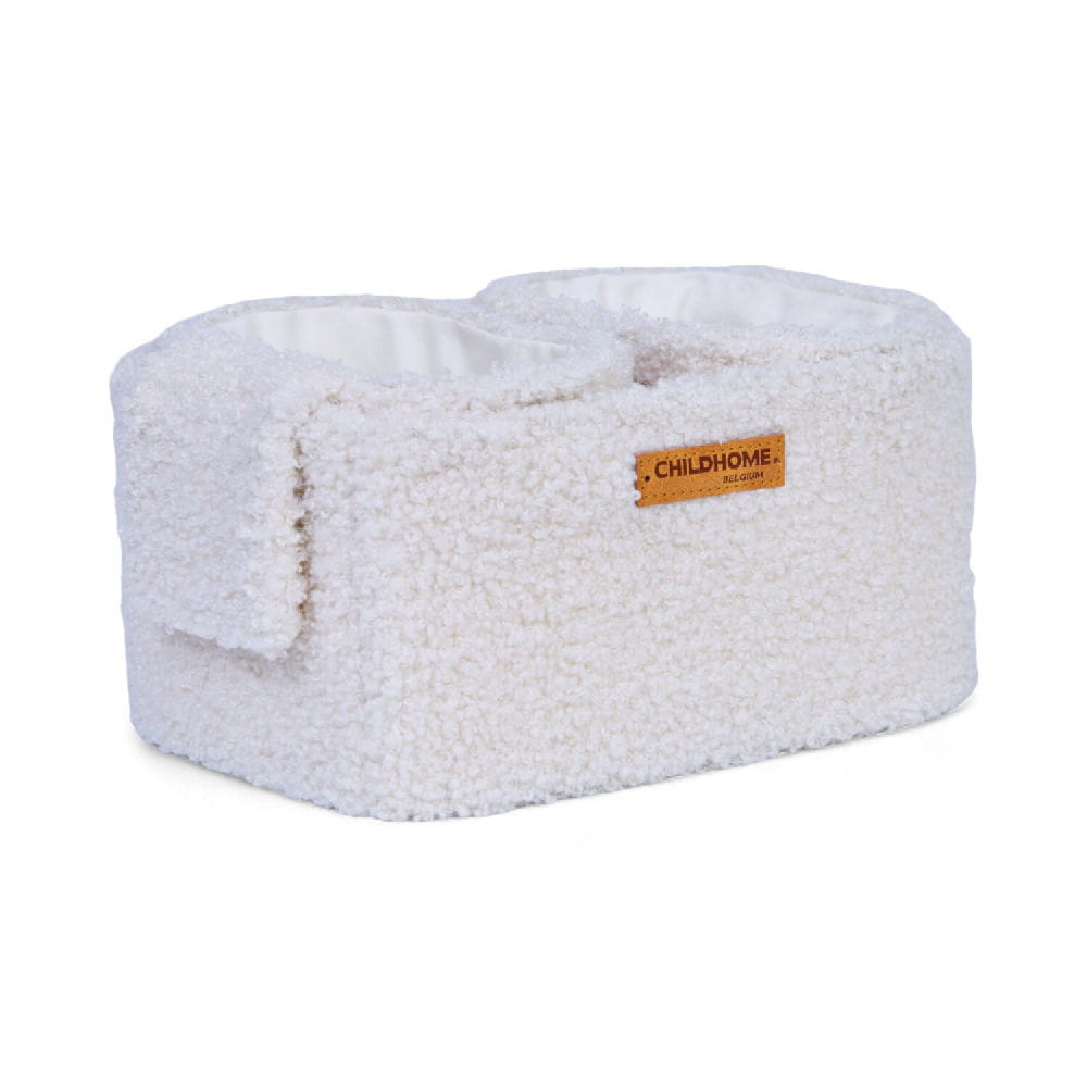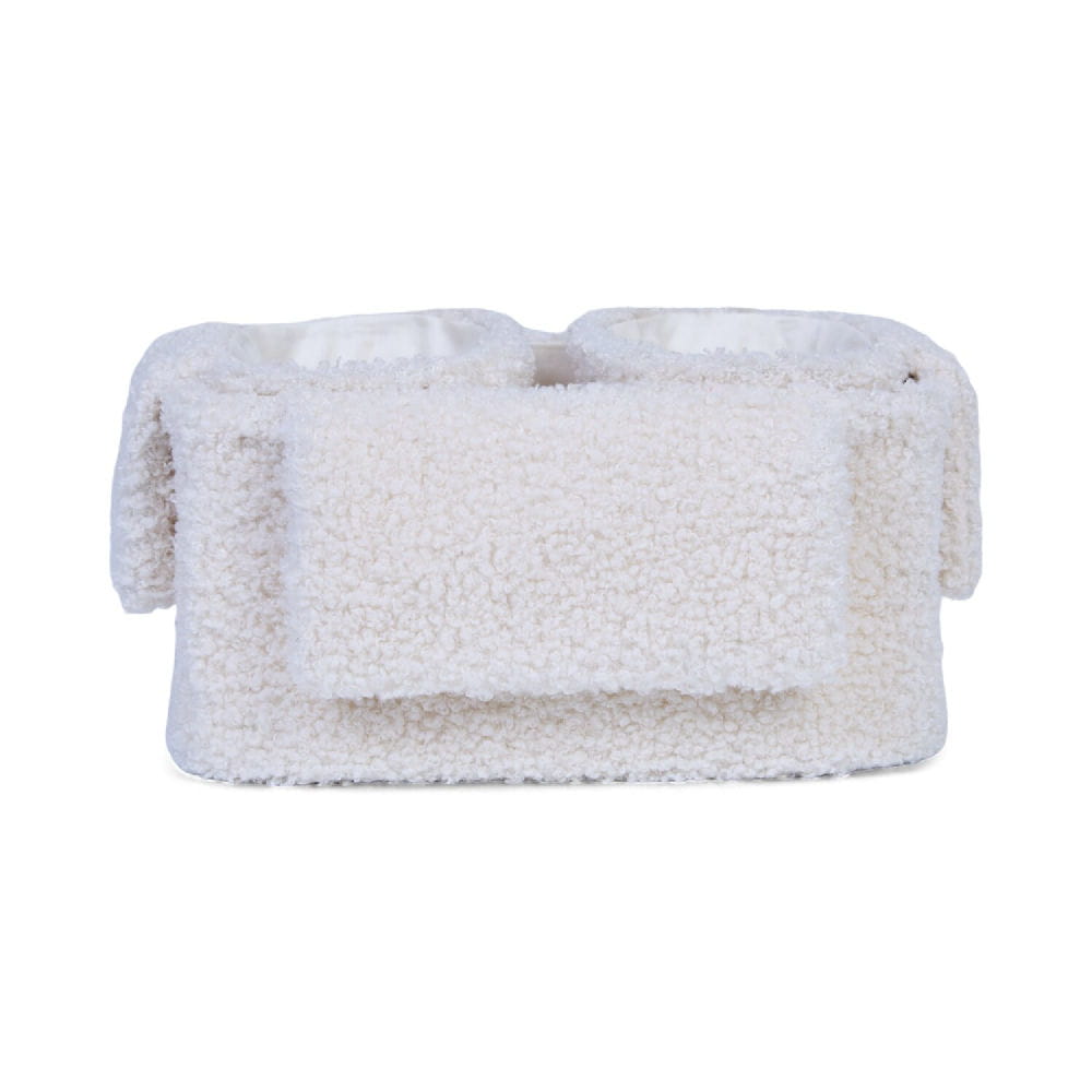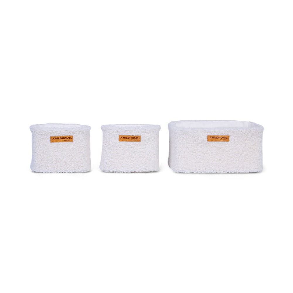 Zestaw 3 dekoracyjnych pojemników do przechowywania wykonanych z miękkiej i przyjemnej tkaniny teddy w kolorze off-white. Koszyki można łatwo przymocować dzięki uchwytom z tyłu, np. do stolika Childhome Evolux, lub zawiesić na łóżeczku. Pojemniki są idealne do przechowywania pieluszek, chusteczek, a także zabawek.