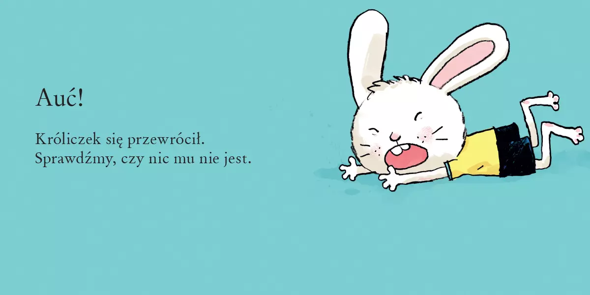 Ojej, króliczek upadł. Czy nic mu nie jest? O nie! Krew! Skaleczył się. Trzeba podmuchać, nakleić plasterek, otrzeć króliczkowi łzy.