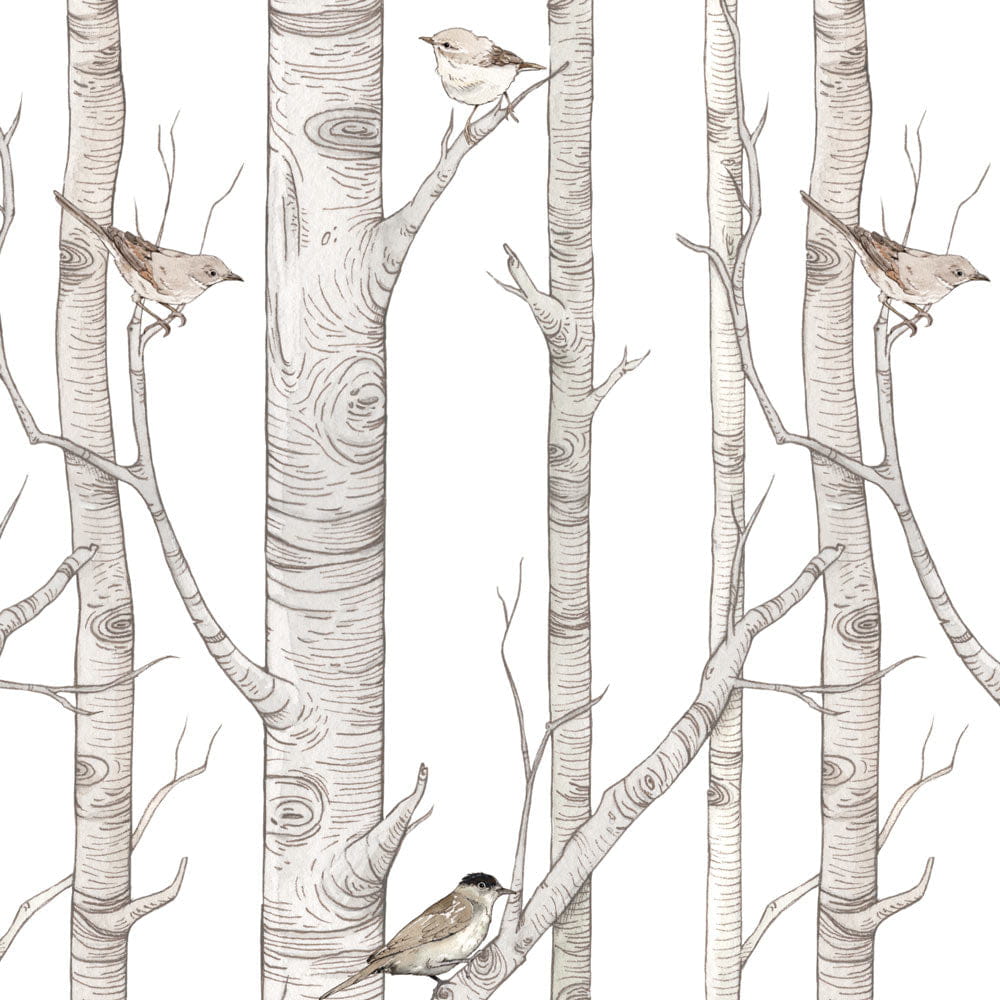 Wyjątkowo delikatna tapeta z drzewami i ptaszkami. Wszystko utrzymane w barwach brązu i beżu, na białym tle. To połaczenie kolorystyczne sprawia, że tapeta nie przciemnia wnętrza pokoju. Te drzewa cudownie wyglądają nad dzicięcym łozkiem lub w kąciku zabaw.