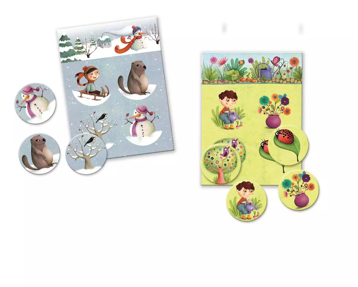 Loteryjka obrazkowa, pokazująca dzieciom zmiany zachodzące w przyrodzie w ciągu roku. Każde dziecko lub rodzic i dziecko ma inną porę roku i znajduje element pasujący do swojego obrazka.W zestawie znajduje się 16 kart-obrazków i 4 plansze.