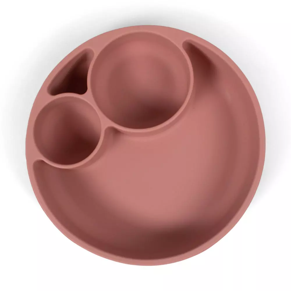 Silikonowy talerz podzielony jest na sekcje z jedną dużą komorą i dwiema małymi miseczkami, co sprawia, że talerz jest idealnym wyborem dla rodziców stosujących metodę BLW.