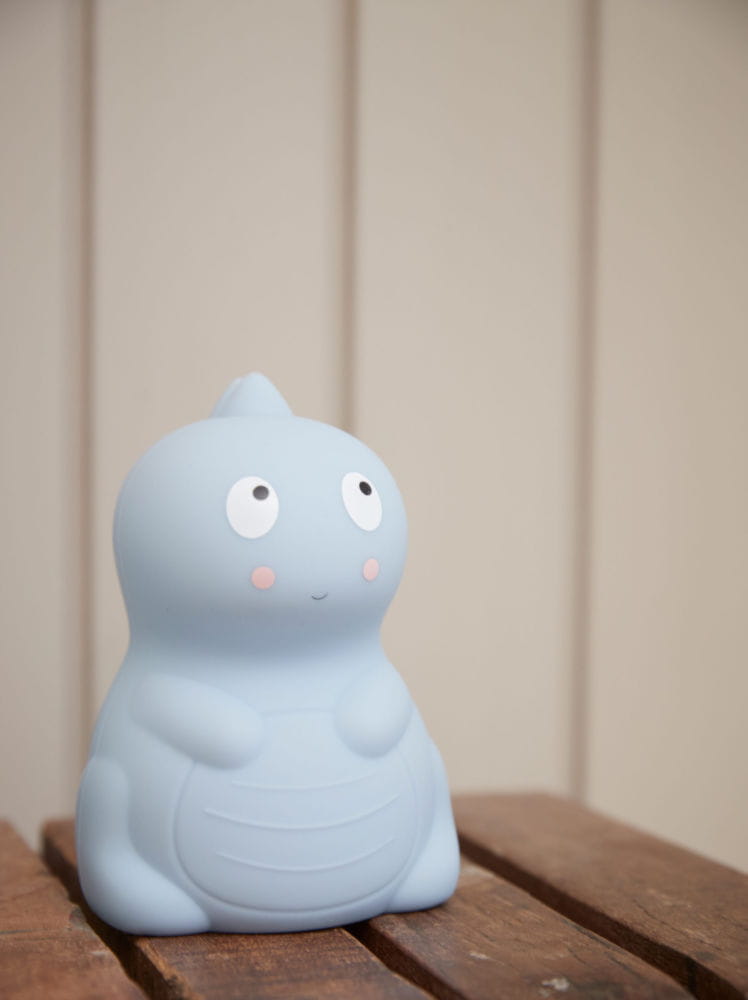 Urocza lampka LED w kształcie dinozaura, w modnym kolorze dusty blue.