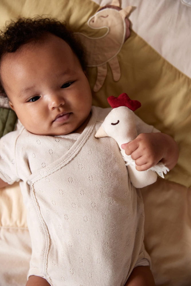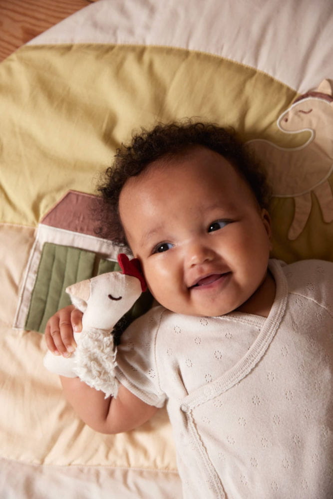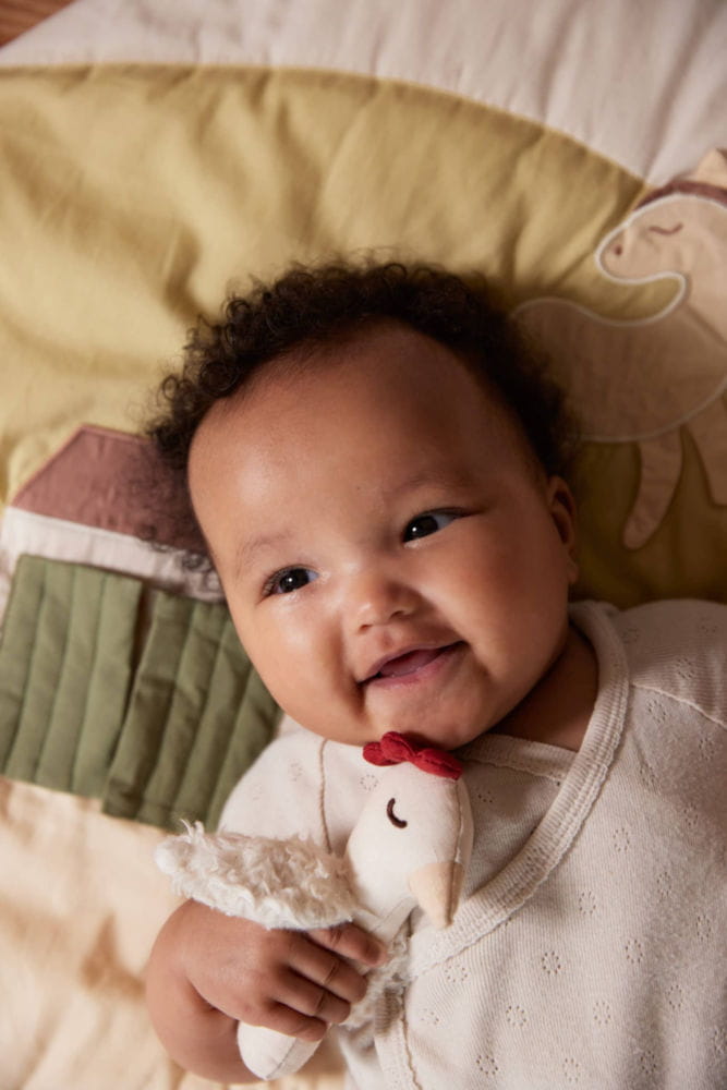 Drobne, wyhaftowane detale przyciągną uwagę maluszka, zachęcając do dotykania i odkrywania atrakcyjnych elementów zabawki.