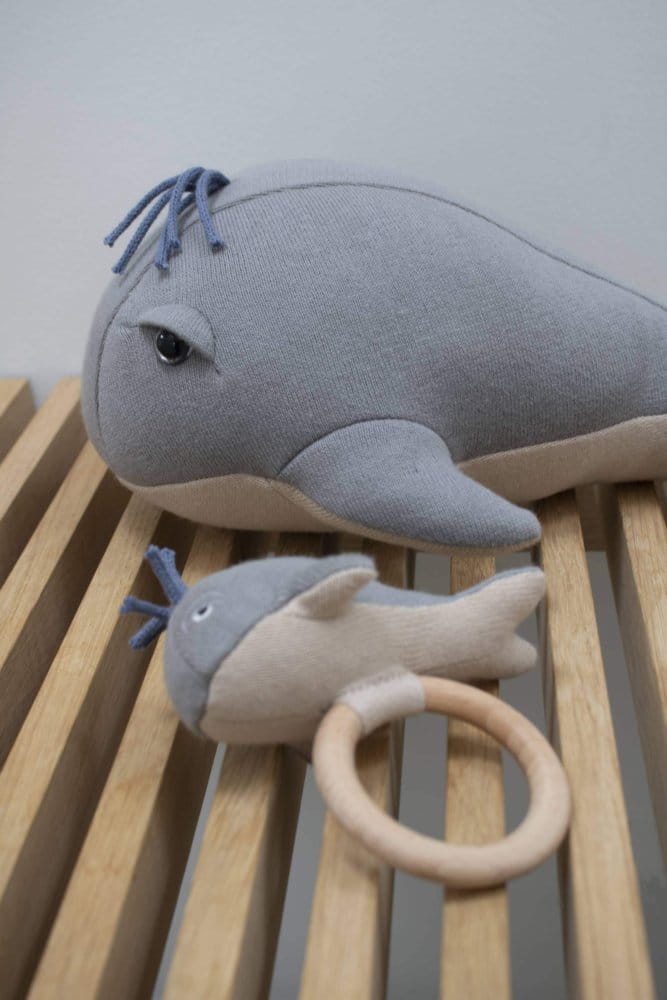 Willie to uroczy, ręcznie robiony wieloryb. Dzięki wszytemu dzwoneczkowi, wydaje przyjemny dźwięk przy potrząśnięciu, a urocze niebieskie wstążki imitują rozprysk wody.