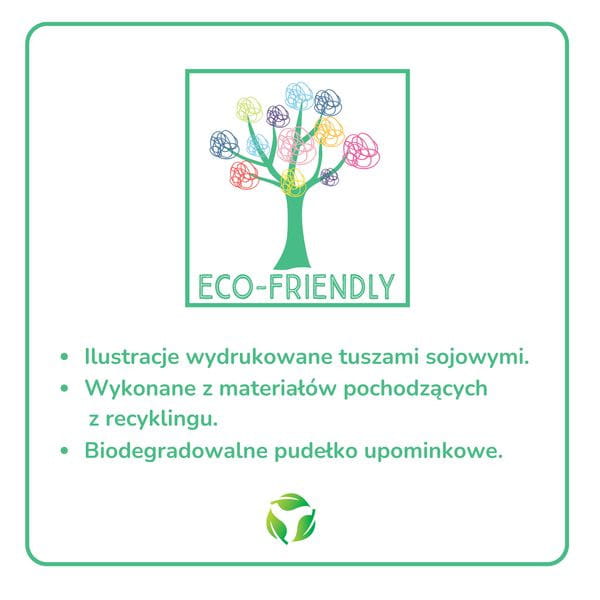 Produkt przyjazny dla środowiska. Szkatułka została wykonane z materiałów pochodzących z recyklingu. Ilustracje zostały wydrukowane tuszami sojowymi. Pudełko upominkowe jest w pełni biodegradowalne.