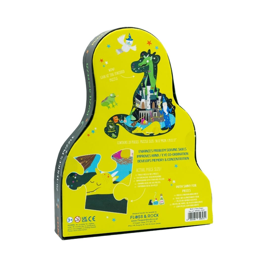 Piękne pudełko i puzzle w kształcie smok. Zestaw składa się z 20 dużych puzzli odkrywających po złożeniu dwa sympatyczne smoki, czarodzieja z magiczną różdżką i wspaniały zamek otoczony fosą. Dzięki naszym puzzlom dzieci mogą trenować koordynację ruchową, uczyć się cierpliwości i wytrwałości, rozpoznawania kolorów i kształtów oraz rozwiązywania problemów.