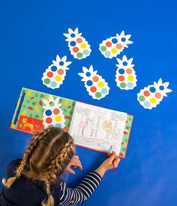 Spiralnie oprawiony blok zawiera 8 wspaniałych obrazków Dżungli do pomalowania i 8 palet farbek w kształcie ananasa, jak i praktyczny pędzelek. Za pomocą delikatnego pociągnięcia pędzelka nawilżonego niewielką ilością wody i farbką można namalować swój własny obrazek! Palety z farbkami i pędzelek są bezpiecznie przechowywane w podkładce, gdy nie są używane, dzięki czemu kolorowanki idealnie nadają się do malowania w podróży!