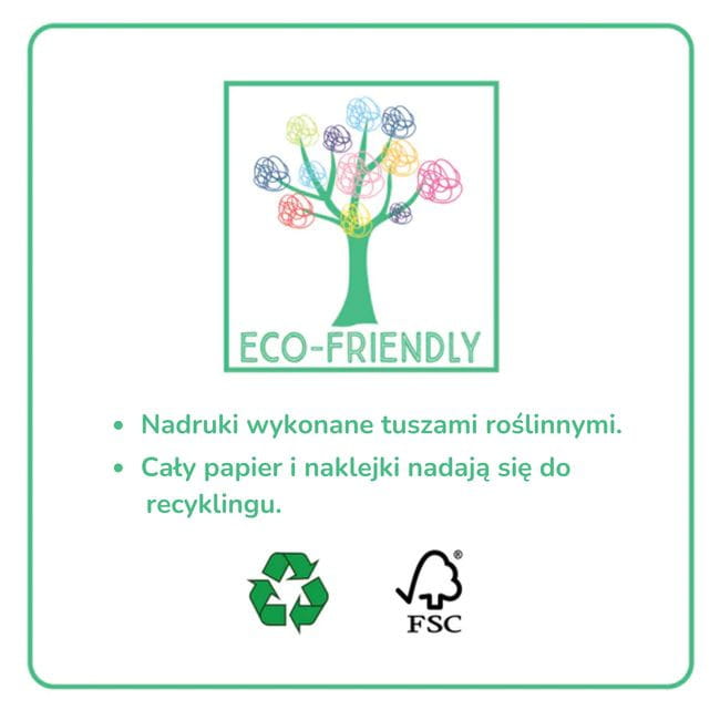 Produkt przyjazny dla środowiska. Nadruki wykonane tuszami roślinnymi. Cały papier i naklejki nadają się do recyklingu.