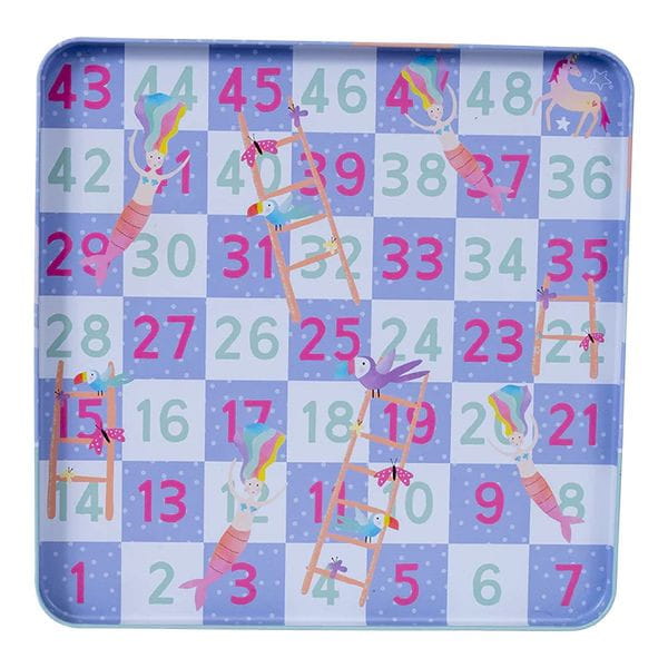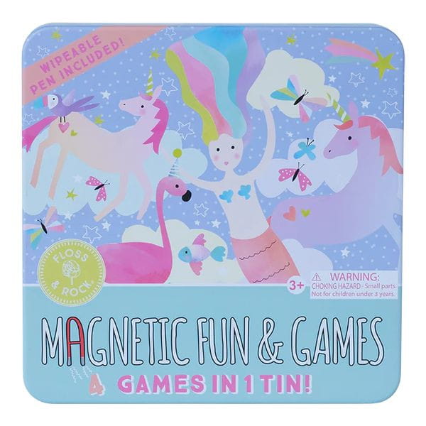 Zestaw czterech popularnych gier i zabaw magnetycznych w jednym pudełku dla młodszych, jak i starszych. Ciesz się graniem i zabawą z przyjaciółmi i rodziną lub w pojedynkę. Tematyka zestawu nawiązuje do bajecznie kolorowej Krainy Fantazji. Zestaw zawiera: grę syrenki i drabiny, grę kółko i krzyżyk, planszę do zabawy logicznej w wyszukiwanie słów oraz planszę z syrenkami, jednorożcami i zabawnymi zwierzakami do kreatywnej zabawy. Wszystkie plansze i elementy są magnetyczne. W zestawie znajduje się woreczek do przechowywania wszystkich drobiazgów oraz długopis do wyszukiwania słów i wycierania na sucho. Całość zapakowana jest w atrakcyjne metalowe, poręczne pudełko, dzięki czemu zestaw idealnie sprawdzi się w podróży i do zabawy na świeżym powietrzu.