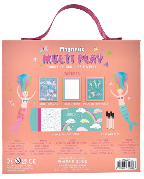 Układaj puzzle, rysuj, koloruj i baw się! Zestaw magnetyczny Kraina Fantazji to cztery lubiane i popularne zabawy w jednym pudełku, które gwarantują dzieciom świetną i kreatywną zabawę na wiele godzin. Zestaw po rozłożeniu odsłania składającą się z 20 elementów magnetycznych atrakcyjną układankę, 4 kolorowe pisaki z gumkami do wycierania na sucho, plansze do rysowania i pisania oraz syreny, jednorożce, flamingi, motyle, tęcze do niekończącej się zabawy na planszy magnetycznej. Pudełko składa się na płasko i jest wyposażone w poręczny uchwyt do przenoszenia, dzięki czemu idealnie sprawdza się w podróży, jak i do zabawy na świeżym powietrzu.