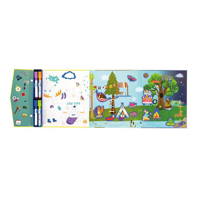 Układaj puzzle, rysuj, koloruj i baw się! Zestaw magnetyczny Przygoda to cztery lubiane i popularne zabawy w jednym pudełku, które gwarantują dzieciom świetną i kreatywną zabawę na wiele godzin. Zestaw po rozłożeniu odsłania składającą się z 20 elementów magnetycznych atrakcyjną układankę, 4 kolorowe pisaki z gumkami do wycierania na sucho, plansze do rysowania i pisania oraz łosia, niedźwiedzia obserwującego gwiazdy, wiewiórkę grającą w karty, ptaki, owady, żaby do niekończącej się zabawy na planszy magnetycznej. Pudełko składa się na płasko i jest wyposażone w poręczny uchwyt do przenoszenia, dzięki czemu idealnie sprawdza się w podróży, jak i do zabawy na świeżym powietrzu.