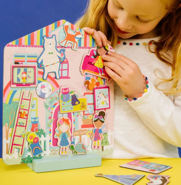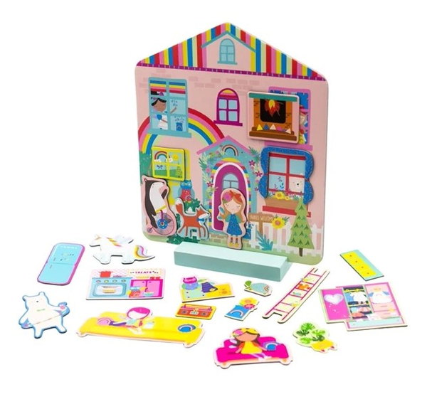 Wejdź do środka, rozgość się i baw się godzinami, dekorując swój własny magnetyczny domek Tęczowych Wróżek. Domek jest dwustronny z fasadą z jednej strony i wnętrzem domu z drugiej. Dzięki ponad 40 magnetycznym elementom możesz stworzyć nieskończenie wiele pięknych wystrojów pokojów. Aby ułatwić zabawę do zestawu dołączony jest drewniany stojak, dzięki któremu domek można obracać. Zestaw zapakowany jest w bajeczne pudełko, w którym znajdują się 2 wysuwane szuflady, aby bezpiecznie przechowywać wszystkie drobiazgi.