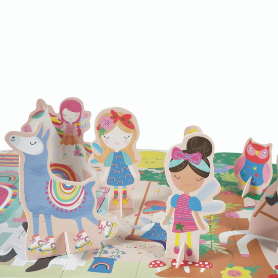 Puzzle Tęczowe Wróżki to piękny zestaw puzzli zapewniający dzieciom ciekawą i rozwijającą rozrywkę. Gdy Twoja bajeczna układanka podłogowa będzie gotowa, wyciągnij 16 figurek i postaw je na stojakach. Wróżki, sowy, tańczący niedźwiadek hula hop, a nawet lama na rolkach są gotowe na rozpoczęcie zabawy i przeżywać najróżniejsze przygody. Po zakończeniu zabawy puzzle i figurki możesz schować ozdobnego pudełka. Układanie puzzli świetnie wpływa na rozwój zdolności manualnych, trenuje małą motorykę, uczy cierpliwości, koncentracji i spostrzegawczości.