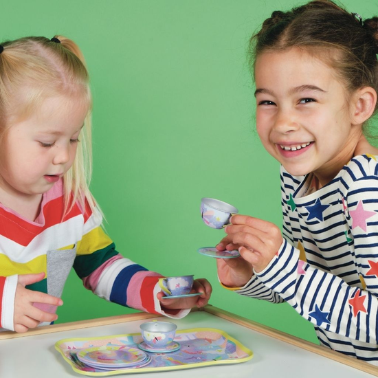 Zestaw do herbaty ozdobiony wspaniałymi, kolorowymi ilustracjami z motywem Krainy Fantazji to gwarancja świetnej zabawy! W kolorowej metalowej walizeczce znajduje się fantastyczny grający czajniczek z melodią „Twinkle Twinkle Little Star”, cztery filiżanki, cztery spodki, cztery talerze i jedna taca. Zestaw herbaciany pozwala na zabawę w dom i odgrywanie ról, stanowiąc również świetną propozycję zabawy dla dzieci w grupie. Uczy umiejętności społecznych i nawiązywania relacji. Walizeczka wyposażona jest w poręczny uchwyt, dzięki czemu można je łatwo przenosić z miejsca na miejsce.