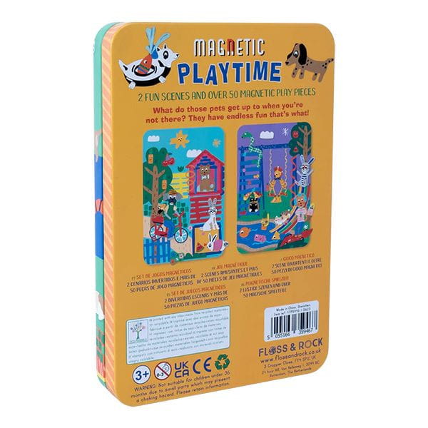 Magnetyczna układanka z motywem zabawnych Zwierzaków zawiera ponad 50 zabawnych magnetycznych elementów i dwie bajecznie kolorowe scenki znajdujące się na wewnętrznych stronach pudełka. Za ich pomocą można tworzyć wspaniałe scenki z latającymi kotami, zabawnymi żółwiami, psami na rowerach i wieloma innymi postaciami. Po skończonej zabawie magnetyczne pudełko bezpiecznie przechowa wszystkie elementy. Magnetyczna układanka Floss & Rock to doskonała zabawa, rozwijająca kreatywność i wyobraźnię, uwielbiana przez dzieci!