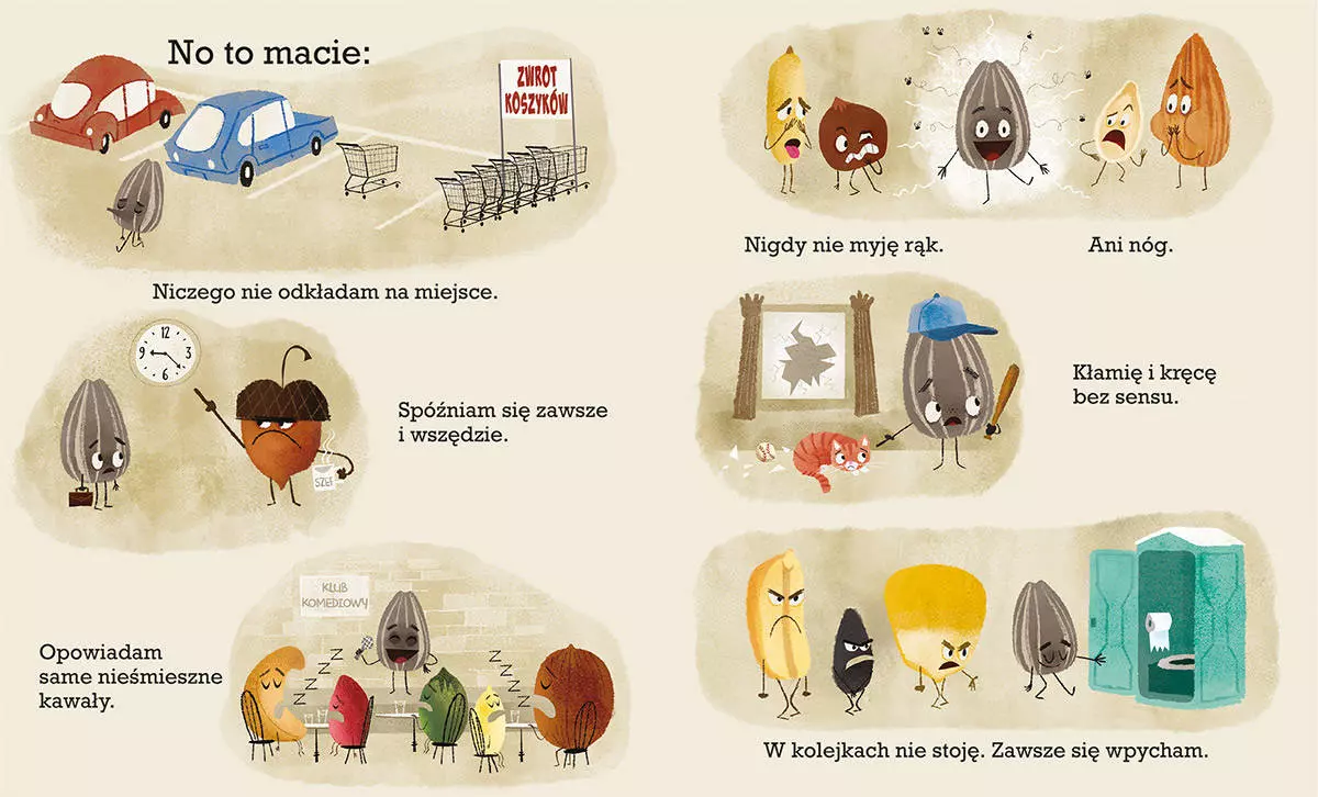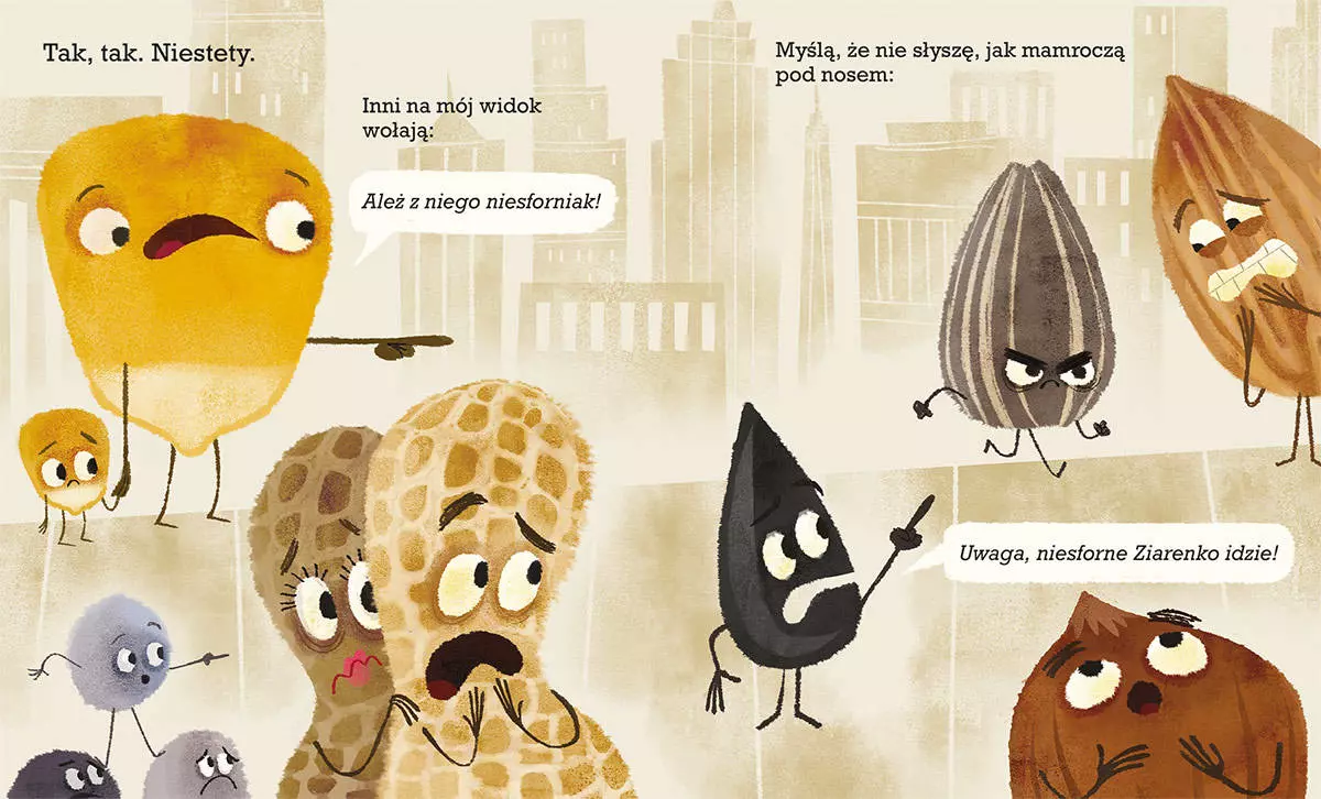 Niesforne Ziarenko to postrach okolicy i nicpoń, jakich mało. Wepchnie się w każdą kolejkę, dobre wychowanie dla niego nie istnieje, a i z higieną jest na bakier. Dzieci straszy przerażającą miną, kawały, które opowiada, nikogo nie śmieszą, a wszelkie zasady istnieją dla niego tylko po to, aby je łamać. Ale… czy zawsze tak było? I czy tak być musi? Ta mądra, pozytywna, a przy tym zabawna i wielopoziomowa opowieść to sposób na to, by w przystępny i bezpośredni sposób zaprosić dziecko do rozmowy o emocjach, uczuciach, niepisanych zasadach społecznego współżycia, a wreszcie - o szacunku dla innych i dla siebie samego. Kapitalnie napisana, brawurowo przetłumaczona i wspaniale zilustrowana książka to niezwykły prezent zarówno dla młodszych, jak i starszych czytelników. Maluchy znajdą tu zabawną historyjkę, a starsi – uniwersalną przypowieść o tym, że nawet największe nicponie zasługują na to, by dać im drugą szansę, a to, co robimy, nie zawsze świadczy o tym, jacy jesteśmy w głębi duszy. W serii ukazała się również książka Wzorowe Jajo, a kolejne tytuły autorstwa Jory’ego Johna i Pete’a Oswalda już niebawem w księgarniach.