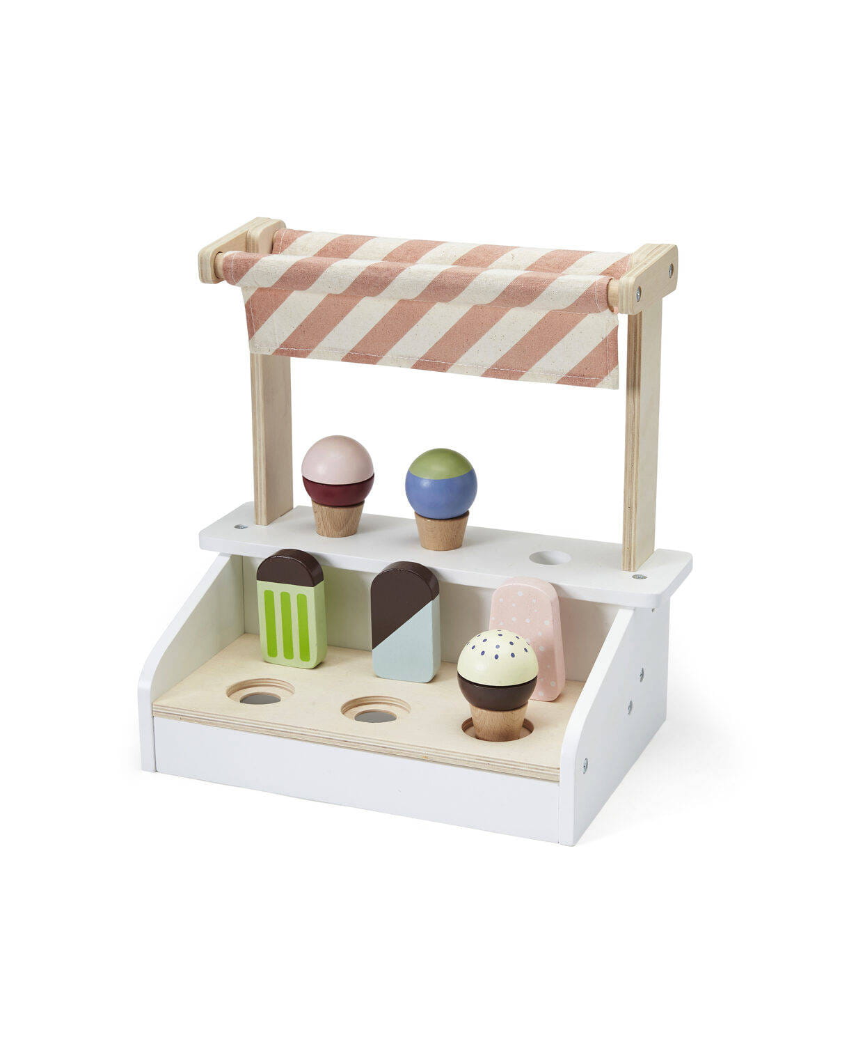 - Materiał: Stojak na lody: sklejka lipowa. Wafelek, patyk: buk. Lody: schima. Tkanina: bawełna.