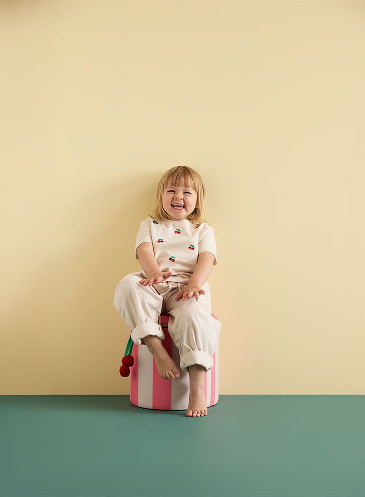 Sprzątanie też może być zabawą - nawet po całym dniu intensywnej zabawy. Ta pasiasta pufa z pomponami powstała z myślą o tym, aby codzienne przedmioty były jednocześnie praktyczne i radosne. Łączy funkcję siedziska oraz pojemnego schowka, wprowadzając do wnętrza lekkość i kolor.