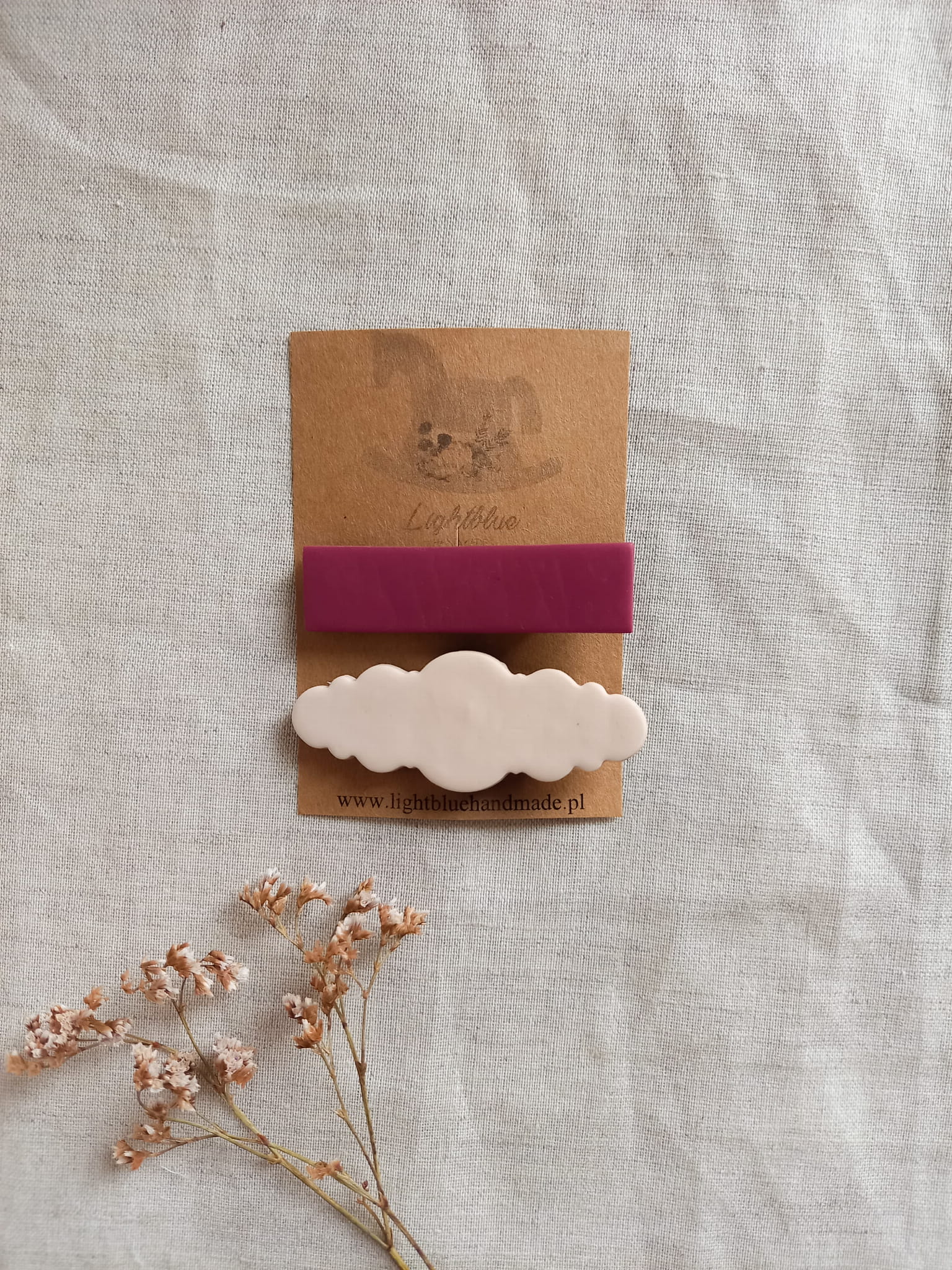 Umocowane na spince pyku. Wykończone matowo, będą świetnym dodatkiem zarówno do sukienki jak i bardziej sportowego stroju. Mocno trzymają włosy, sprawdzą się również dla dorosłych. Spinki nie zawierają gotowych elementów, są ręcznie wykonane począwszy od koloru, przez wzór, aż po wykończenie.
