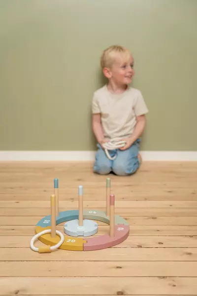 Gra w rzucanie pierścieniem FSC od Little Dutch. Skup się, celuj i rzucaj! Spróbuj wrzucić koło z bawełnianej linki na słupek w odpowiadającym mu kolorze i zdobądź punkty. Możesz ustawić pole gry w różnych konfiguracjach, dzięki czemu każda gra oferuje nowe wyzwanie. To świetna aktywność dla całej rodziny! Gra w rzucanie pierścieniami rozwinie koordynację ręka-oko Twojego malucha, oszacowanie odległości i dokładne celowanie. Zestaw zawiera 5 drewnianych tarcz celowniczych w różnych kolorach - każda z nich ma przypisaną sobie określoną ilość punktów. Cały zestaw utrzymany jest w uroczej pastelowej kolorystyce i świetnie sprawdzi się jako prezent zarówno dla dziewczynki, jak i dla chłopca.