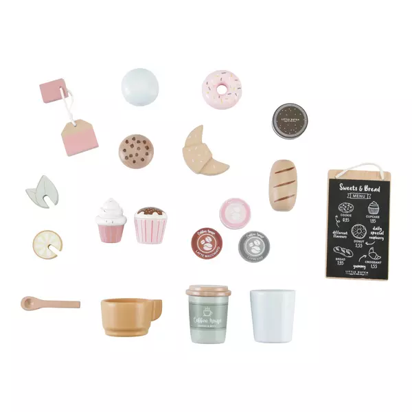 Kawiarenka i wszystkie akcesoria (19 sztuk) wykonane są z drewna z certyfikatem FSC i pokryte bezpieczną farbą na bazie wody w uroczych, pastelowych kolorach. Zabawka pobudza kreatywność i zdolności motoryczne oraz pozwala dzieciom uwolnić wyobraźnię. Świetnie sprawdzi się jako uzupełnienie do Dużej kuchni pastelowej, Dużego drewnianego tortu urodzinowego lub Tostera z akcesoriami. Kawiarenka to doskonały pomysł na prezent dla każdego trzylatka.