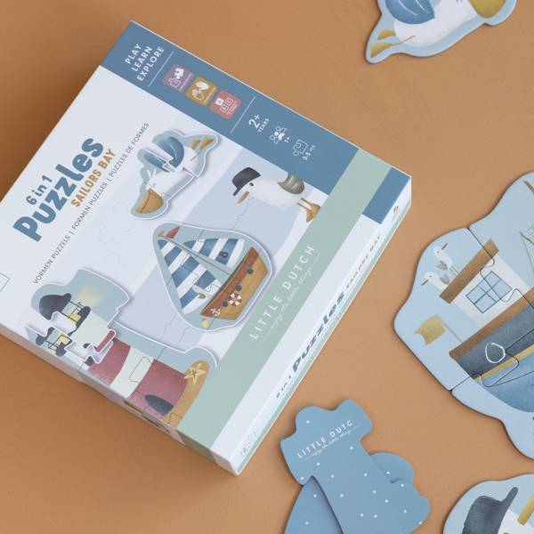 Puzzle 6 elementów od Little Dutch z kolekcji Sailors Bay. Pudełko zawiera 6 różnych puzzli, które są mniej lub bardziej zaawansowane. Puzzle są pięknie ilustrowane motywem morskim. Składają się z 3, 4 lub 5 elementów, dzięki czemu dziecko uczy się krok po kroku rozwijać umiejętności motoryczne, oraz rozwija podstawowe umiejętności, takie jak cierpliwość, rozpoznawanie kształtów oraz rozwiązywanie łamigłówek. Każdy element jest wykonany z wytrzymałego kartonu który ma idealny kształt i rozmiar dla małych rączek. Elementy układanki są duże i wykonane z grubego kartonu. Całość zapakowana w pudełko, dzięki czemu łatwiej utrzymać porządek w dziecięcym pokoju po skończonej zabawie. Stanowi uzupełnienie z pozostałymi produktami z kolekcji Sailors Bay. Idealny pomysł na prezent.