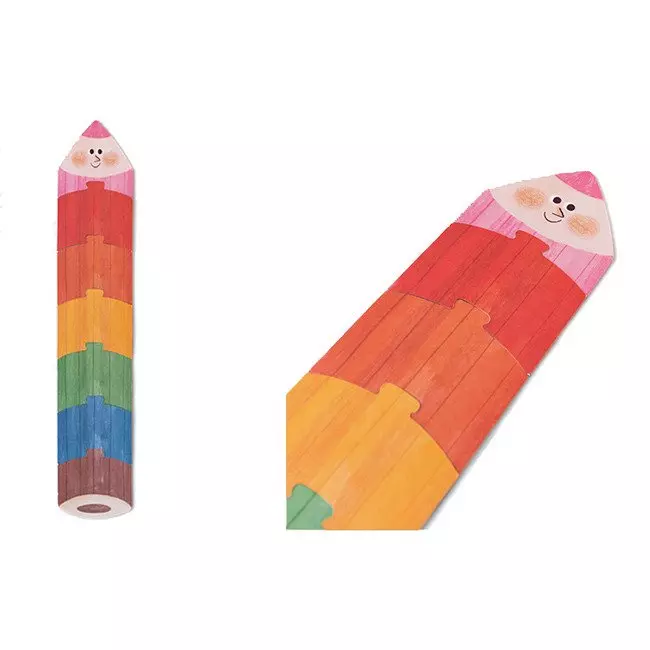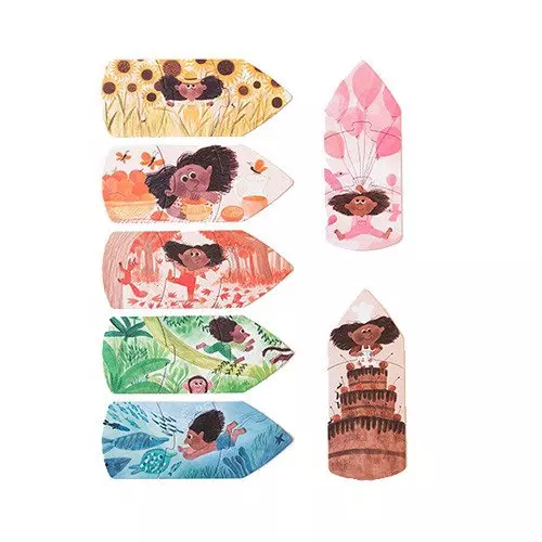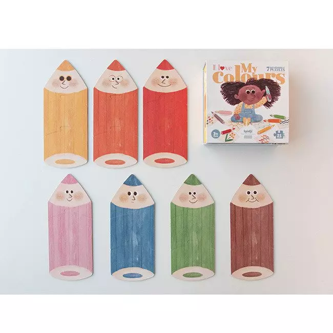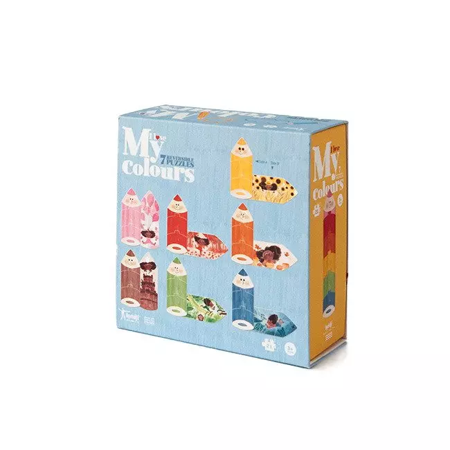Maluch ma za zadanie ułożenie siedem kolorowych kredek. Każda z sekcji - z kredek, składa się z trzech elementów puzzli. Po odwróceniu obrazka można zobaczyć scenkę związaną z dziewczynką i jej przygodami z kolorami.