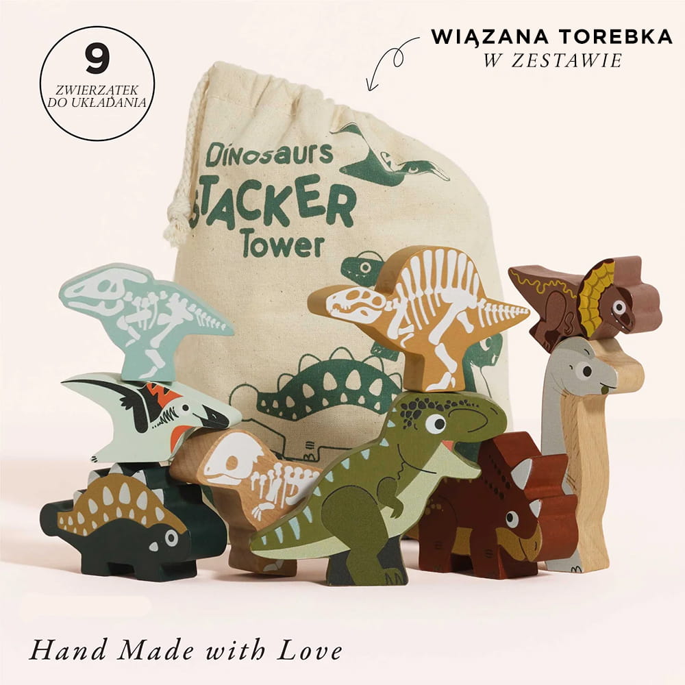 - 9 kolorowych drewnianych dinozaurów do układania z torbą