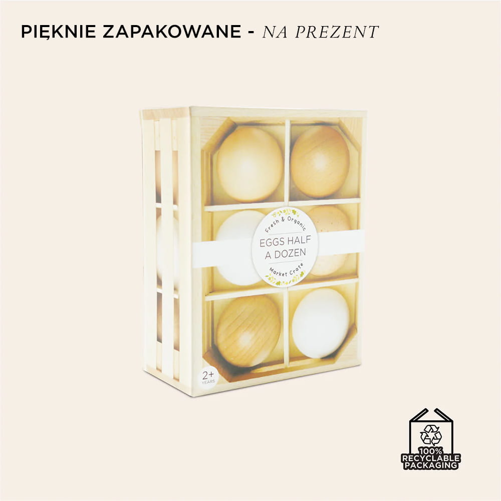 Ta skrzynka zawiera pół tuzina jajek z farmy to bilet do zabawy w odgrywanie ról. Wykonana z drewna z certyfikatem FSC™, ta zabawka edukacyjna jest dostarczana w komplecie z 6 elementami do zabawy z litego drewna, pomalowanymi bezpiecznymi dla dzieci, nietoksycznymi farbami na bazie wody. Wszystko umieszczone w solidnej drewnianej skrzyni do przechowywania z przegródkami, zapewniającymi realistyczną zabawę.
