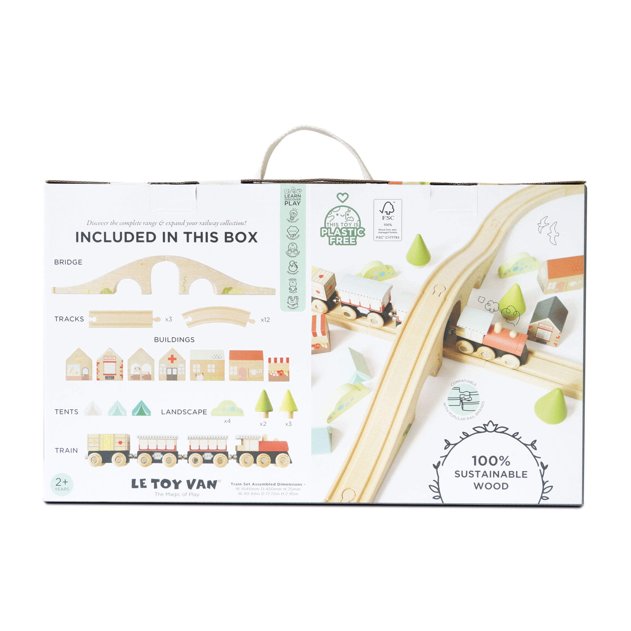 Wykonany z drewna certyfikowanego przez FSC®, ten 40-elementowy zestaw obejmuje tor w kształcie ósemki, trzy łuki mostów i wiele aktywności inspirujących do zabaw rolowych. Drewniane wagoniki są magnetyczne i łączą się, tworząc dłuższy pociąg. Zestaw obejmuje również szczegółowo wykonane budynki, stację, domki, rynek, szpital i farmę, namioty oraz drewniane drzewa i krzewy, dodając jeszcze więcej możliwości realistycznej zabawy.