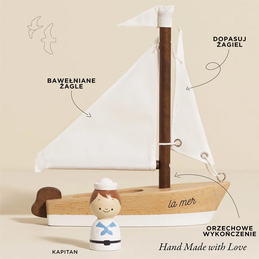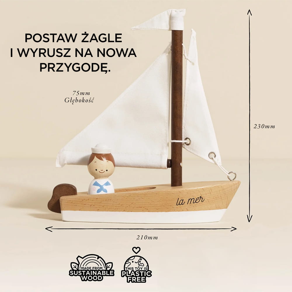 Żaglówka z certyfikatem FSC® to prawdziwy skarb, ręcznie wykonany z dbałością o szczegóły. Pełna ponadczasowego uroku, została stworzona z drewna bukowego z orzechowymi akcentami. Dodatkowe bawełniane flagi i żagle elegancko powiewają na wietrze, napędzając łódź ku nieskończonym horyzontom, co zwiększa wartość zabawy i wyobraźni tej zabawki.