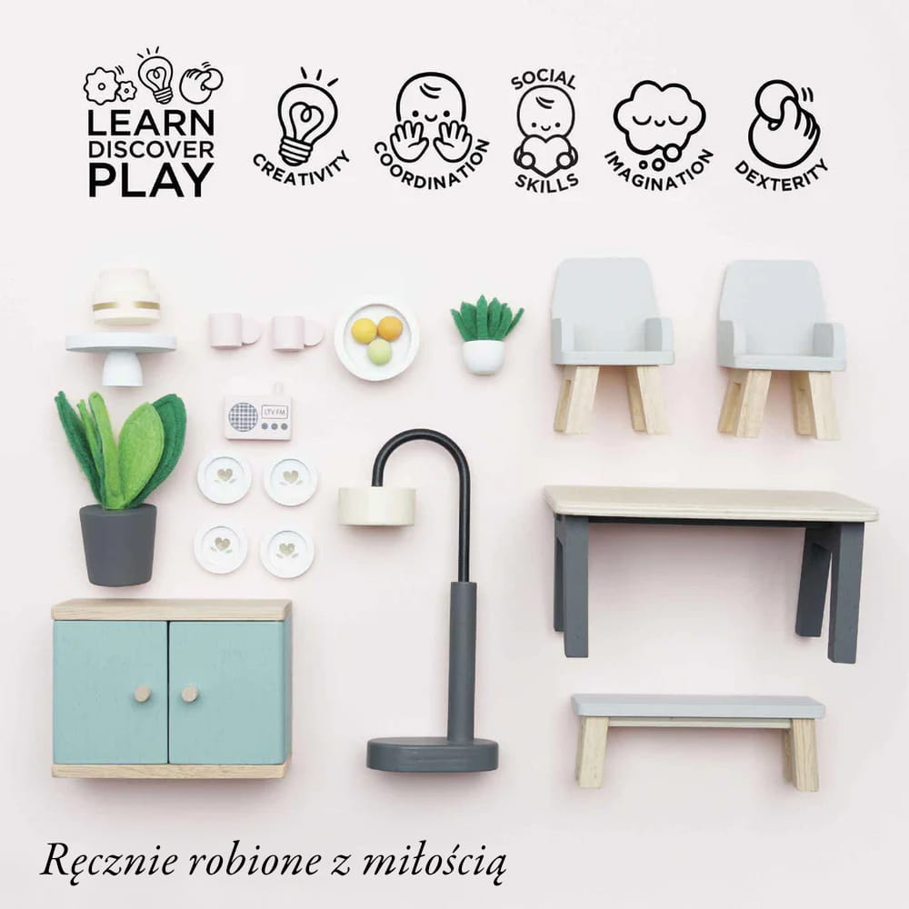 Obejmuje: elegancki drewniany stół z dwoma pasującymi krzesłami i ławką, wolnostojącą lampę, kredens, 2 doniczki z realistycznymi liśćmi z filcu, misę owocową z drewnianymi owocami, radio oraz 4 talerze obiadowe, kubki i efektowny tort umieszczony na paterze – idealny na środek stołu, aby kusić małych gości podczas przyjęcia.