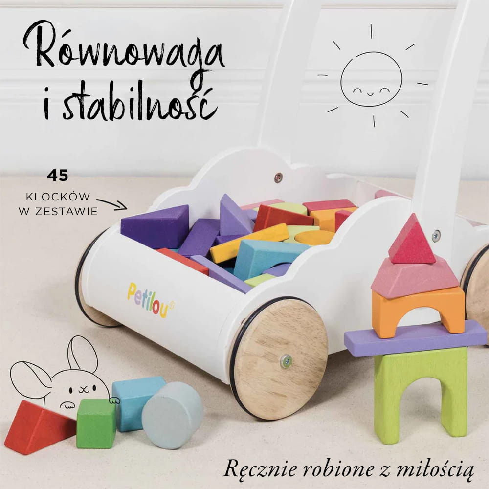 Uwielbiamy wszechstronność tego uroczego chodzika, wyposażonego w 45 trwałych, grubych klocków z drewna kauczukowego pomalowanych w kolorach tęczy przy użyciu bezpiecznych dla dzieci farb. Klasyczny i zabawny sposób na stymulowanie umiejętności psychomotorycznych, naukę rozpoznawania kształtów oraz rozwijanie koordynacji wzrokowo-ruchowej i wyobraźni.