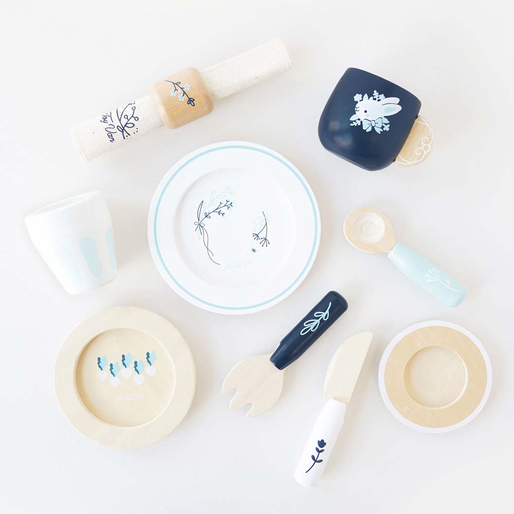 Pomalowany w tonacjach niebieskiego i białego oraz udekorowany uroczymi ilustracjami botanicznymi, ten uroczy zestaw do zabawy w odgrywanie ról obejmuje pełne nakrycie stołu, w tym kubek, podkładkę, filiżankę, 2 talerze, nóż, widelec i łyżkę, a także tkaninową serwetkę z drewnianym uchwytem.