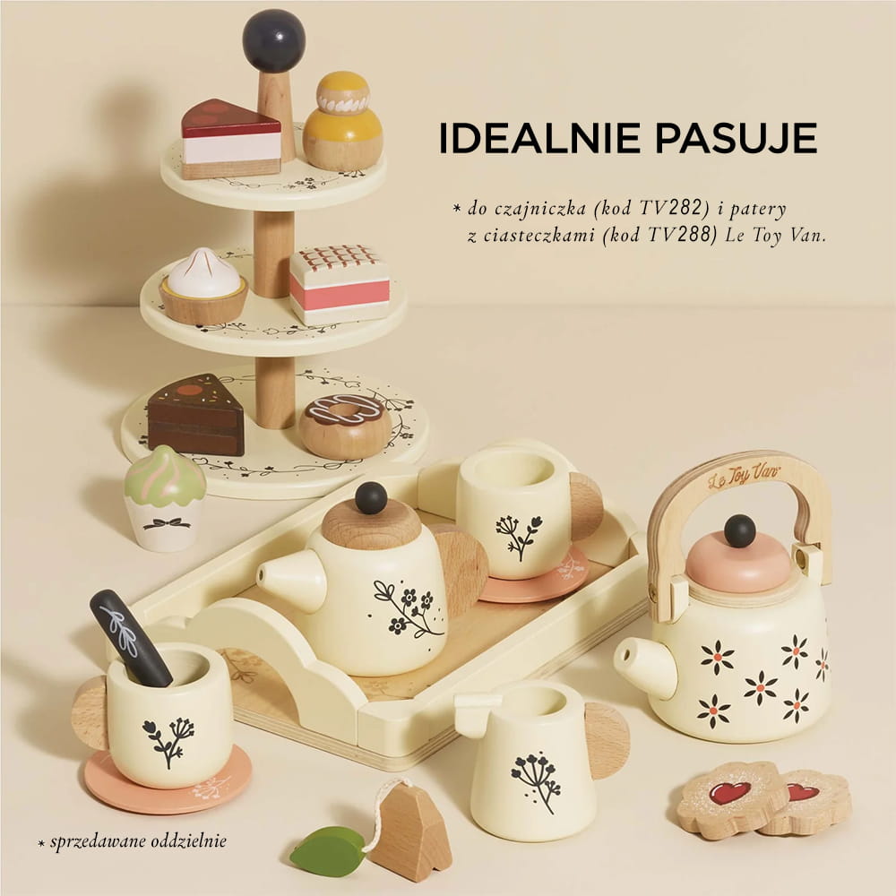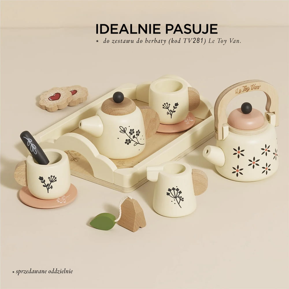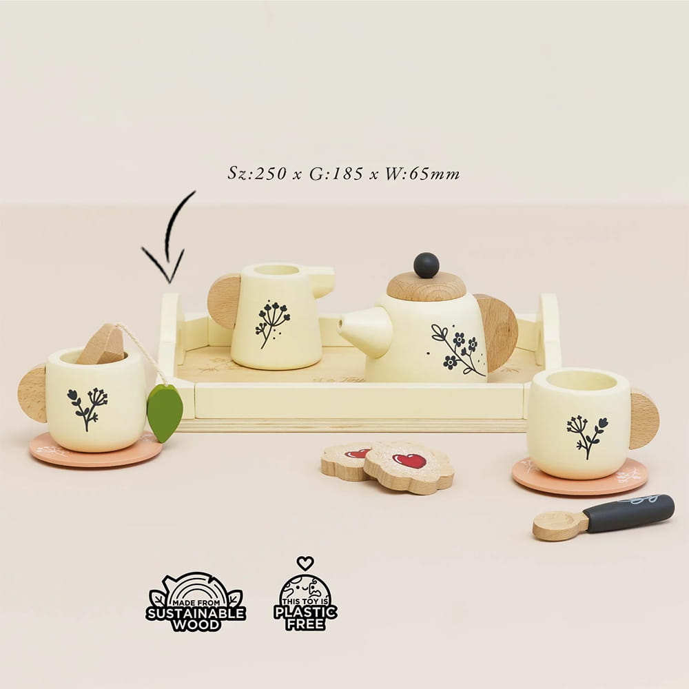 Taca do serwowania umożliwia maluchom łatwe podawanie herbaty. Zestaw jest wykonany z drewna pochodzącego ze zrównoważonych źródeł, wolny od plastiku, wspiera zabawę przyjazną dla środowiska. To idealna zabawka, która rozwija kreatywność i wyobraźnię u najmłodszych.