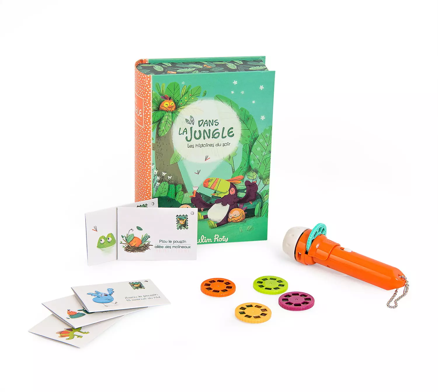 To piękne pudełko zaprojektowane jako książka ukrywa lampkę do projekcji 5 opowieści. Zanurz się w 5 różnych światach dzięki flagowemu produktowi MoulinRoty. Łatwo to działa : włóż historyjkę do lampki, włącz, a obrazy wyświetlą się na ścianie lub suficie. Zestaw zaiera również karty z zaproszeniem nawystępy w formie mini-kopert z tajnymi wiadomościami.