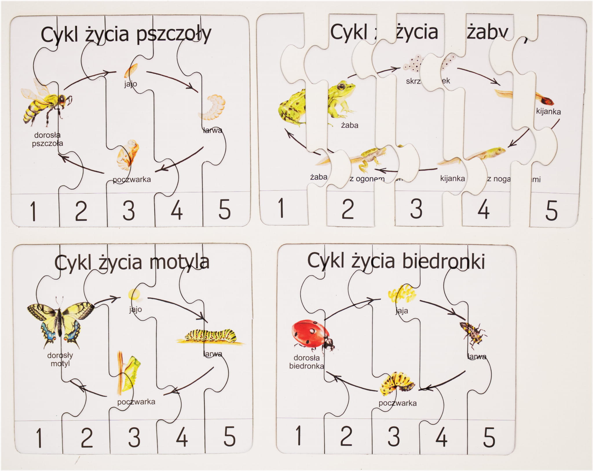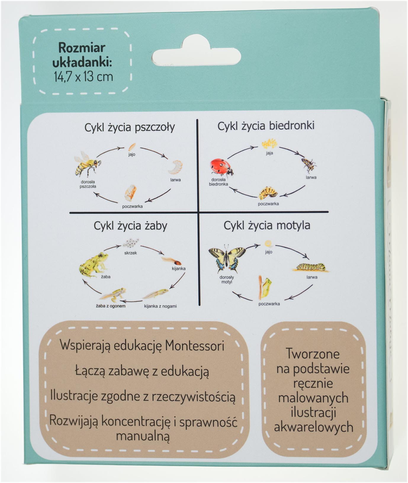 W opakowaniu znajdują się puzzle przedstawiające cykl życia biedronki, motyla, żaby i pszczoły.