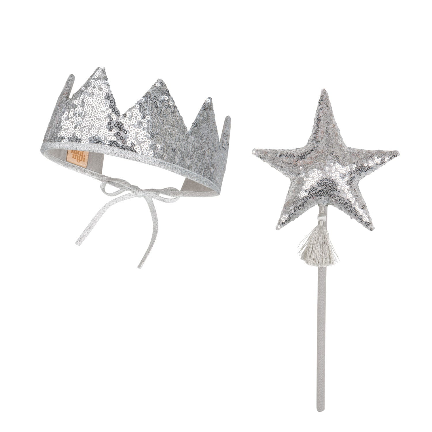 Zestaw składa się z dwóch elementów: korony i różdżki w kolorze srebrnym. Dwustronna korona jest solidnie uszyta z wysokiej jakości tkaniny bawełnianej i cekinów. Dzięki wiązaniu z tyłu pasuje zarówno na głowę malucha jak i rodzica. Różdżka została wykonana z cekinów, bawełny i sosnowego patyczka. Gwiazda przyszyta jest do nóżki, a całość delikatnie ozdobiona pięknym chwostem.