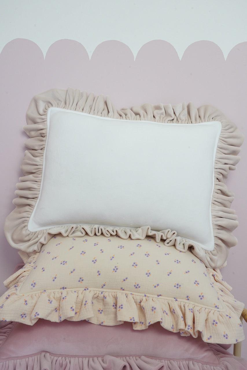 Poduszka pluszowa z romantyczną falbanką, solidnie wykonana i uszyta z wysokiej jakości welwetowej tkaniny z elastanem, która pięknie układa się i błyszczy. Super miła w dotyku, idealna do sypialni i do salonu. Wypełniona wysokiej jakości antyalergiczną kulką silikonową. Można ją śmiało prać w pralce, wkład nie traci puszystości i elastyczności.