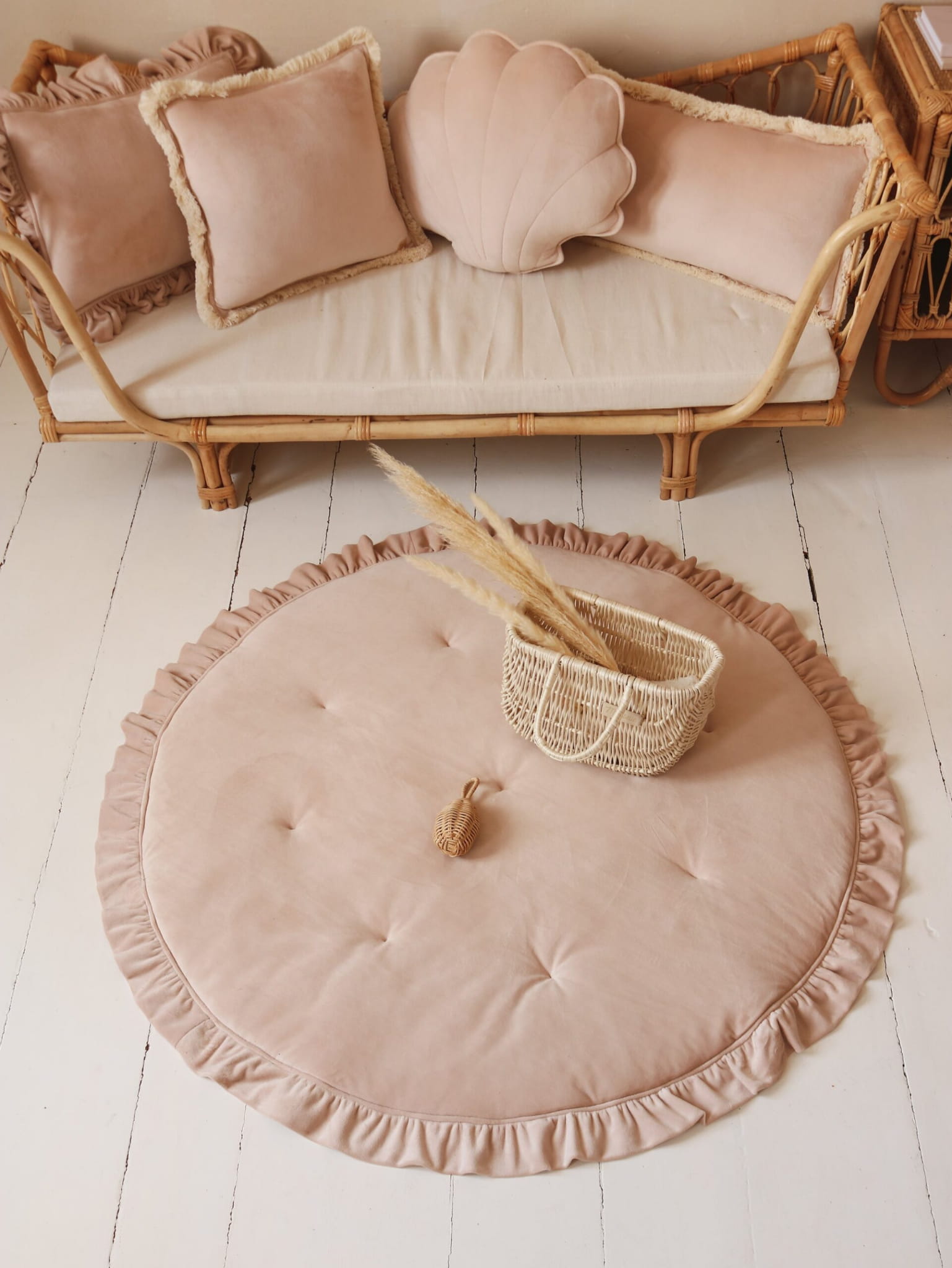 Mięciutka mata pikowana w kolorze latte z romantycznymi falbankami, starannie marszczonymi ręcznie, dodatkowo przeszyta dookoła. Bardzo puszysta tkanina welwetowa układa się pięknie i błyszczy. Każdy pokój nabiera wyjątkowego, bajkowego charakteru :-)