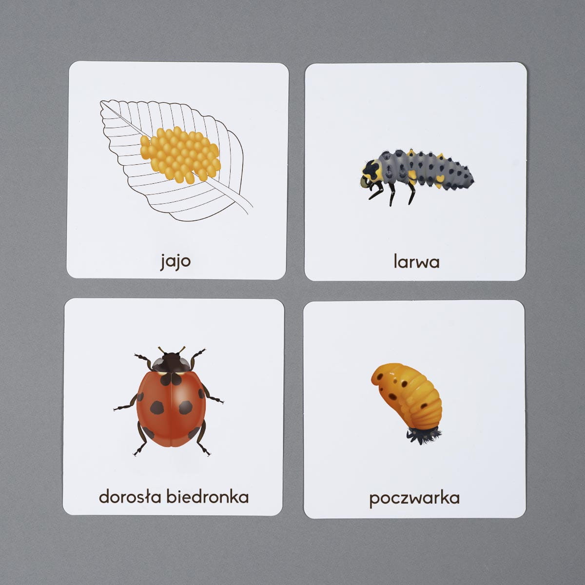 Karty przedstawiają poszczególne stadia rozwoju czyli jajo, larwę, poczwarkę oraz dorosłego owada. Zostały one pokazane na białym tle, tak aby maksymalnie wspierać skupienie uwagi u dzieci. Zestaw zawiera również kartę kontrolną ukazującą kierunek rozwoju biedronki. Plakat oraz pasujące memory umożliwiają dodatkowe aktywności.